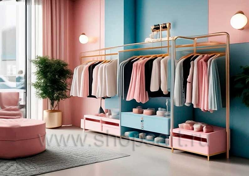 Фотографии торгового оборудования в открытом детском магазине “Бэби Бум”, г. Москва район Марьино, на основе коллекции «РОЗОВАЯ ФАНТАЗИЯ»