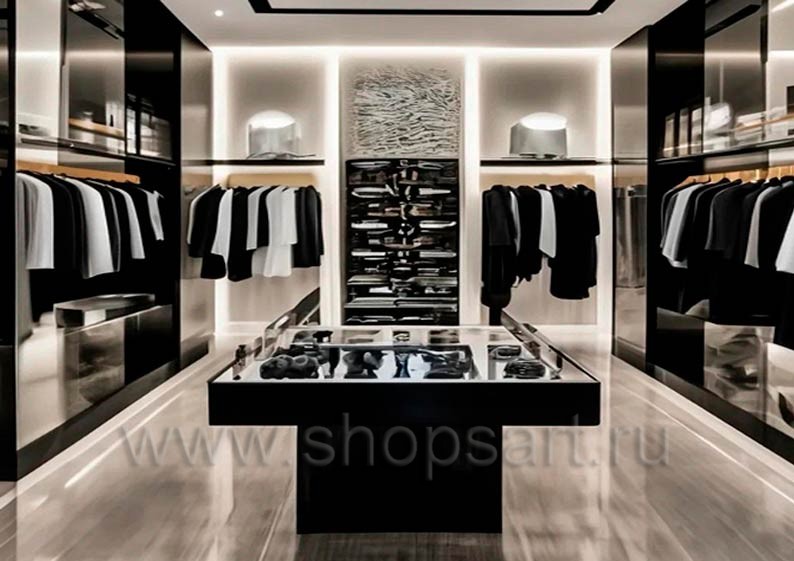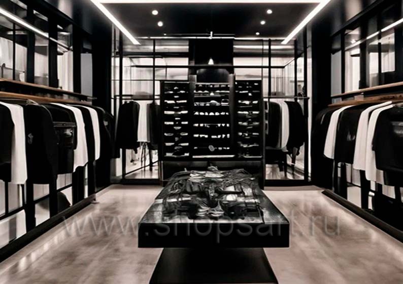 На этой странице Вы можете ознакомиться с дизайном интерьера и дизайном торгового оборудования магазина одежды на основе коллекции торговой мебели «BLACK STAR». Разработала дизайн магазина одежды и дизайн торговой мебели компания «Искусство интерьеров». Узнать больше о наших коллекциях оборудования для одежды Вы можете на странице торговой мебели для одежды.