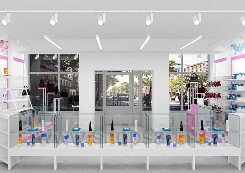 В последнее время все больше предпринимателей отдают предпочтение стилю минимализм в дизайне коммерческих объектов. Плюсом данного интерьерного направления является удачное сочетание лаконичности и функциональности. К тому же, оформление в стиле минимализм не требует больших вложений. При этом такой дизайн магазина косметики смотрится стильно и современно.
