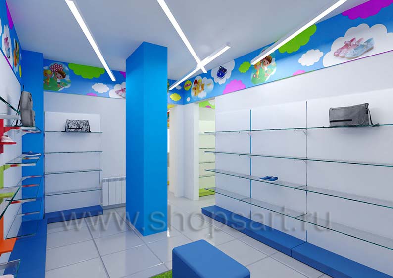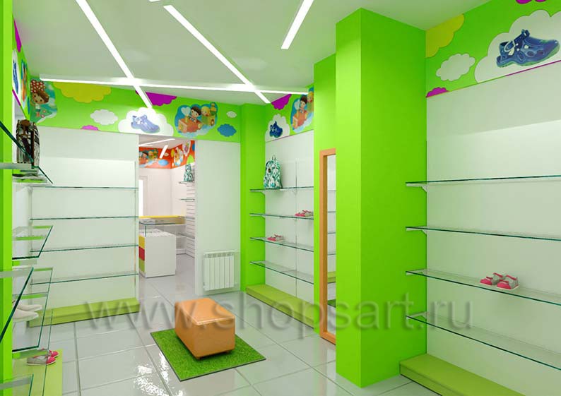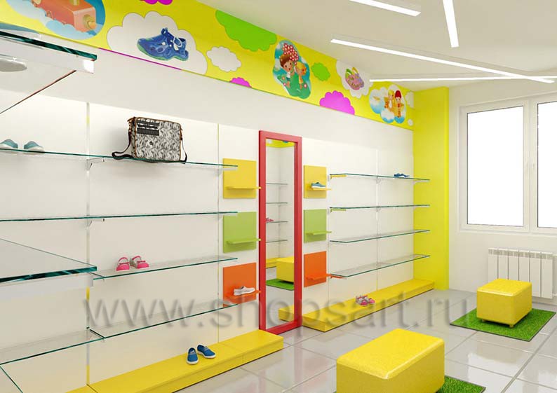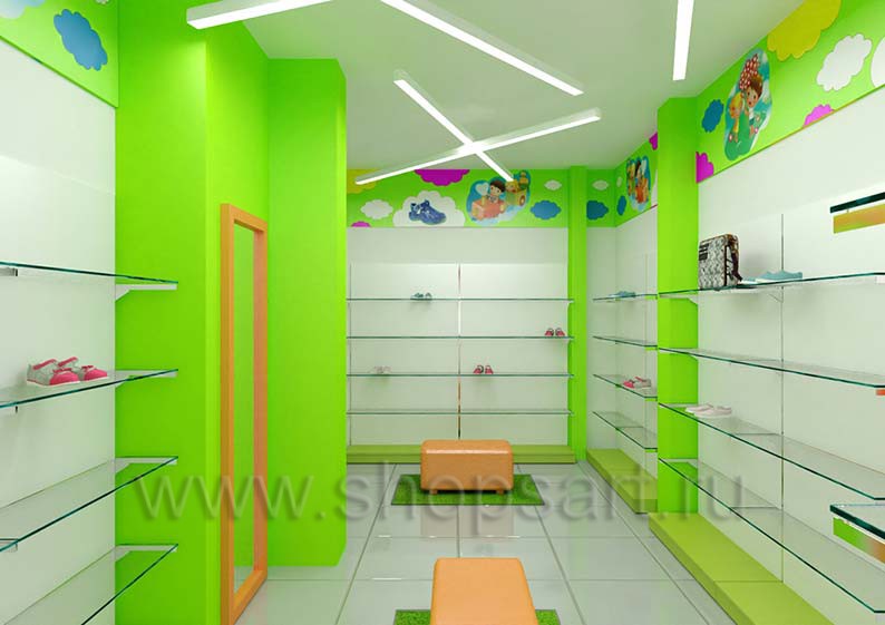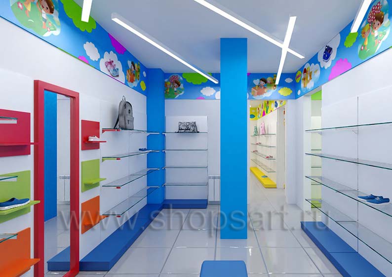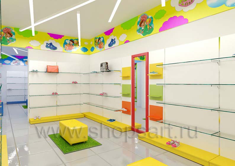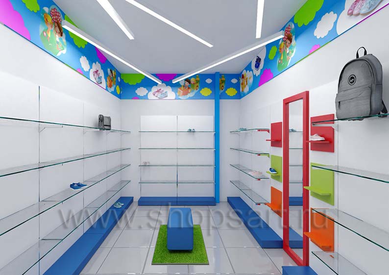 - Чем больше площадь магазина, тем шире возможности для творчества дизайнера. Однако и с точки зрения обеспечения комфорта детям этот критерий обязателен. Дети – резвые создания. Они подвижны, потому им необходимо свободное пространство. Если торговый зал заставлен по всей территории стеллажами, вешалами и островными конструкциями, значительно повышается риск возникновения ушибов и травм у маленьких покупателей. Это недопустимо! Поэтому следует обеспечить просторную свободную площадь на пути маршрута посетителей. Торговое оборудование не должно содержать острых углов и элементов из хрупкого стекла. Также нельзя использовать конструкции, изготовленные из материалов, выделяющих токсические испарения. Это вредно для детского организма.