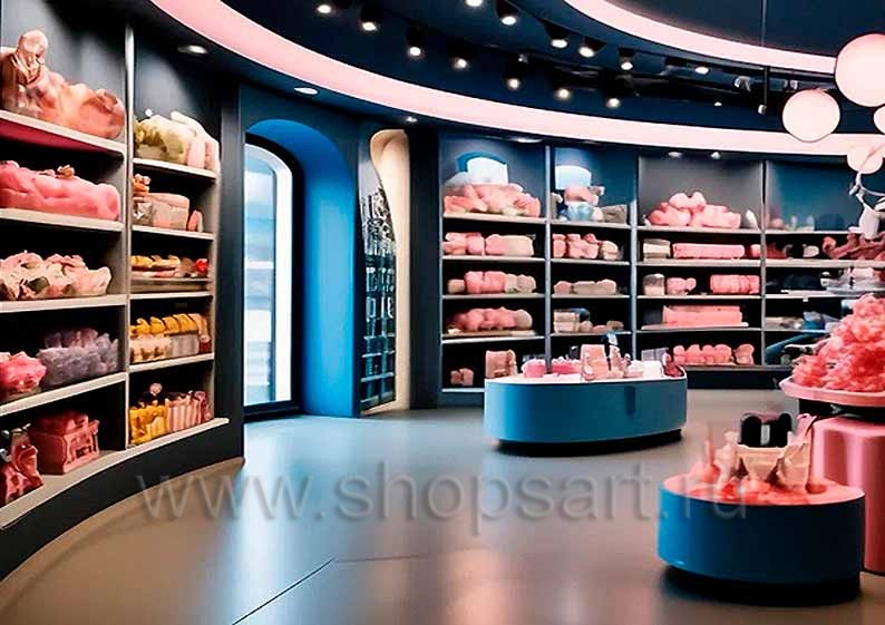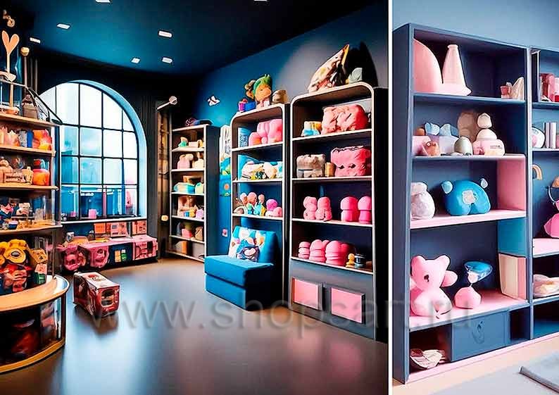 Поскольку для размещения разного рода игрушек (кукол, машинок, плюшевых зверей и т.д.) используются стеллажи и другие торговые конструкции, то уместно сделать упор на дизайне данного оснащения. Мебель для магазина, главными покупателями которого являются дети, должна быть привлекательной именно в восприятии этих юных созданий. Малышам понравится торговое оборудование в виде домиков, пирамидок или машинок. Они будут в восторге от ярких разноцветных торговых стеллажей с подсветкой.