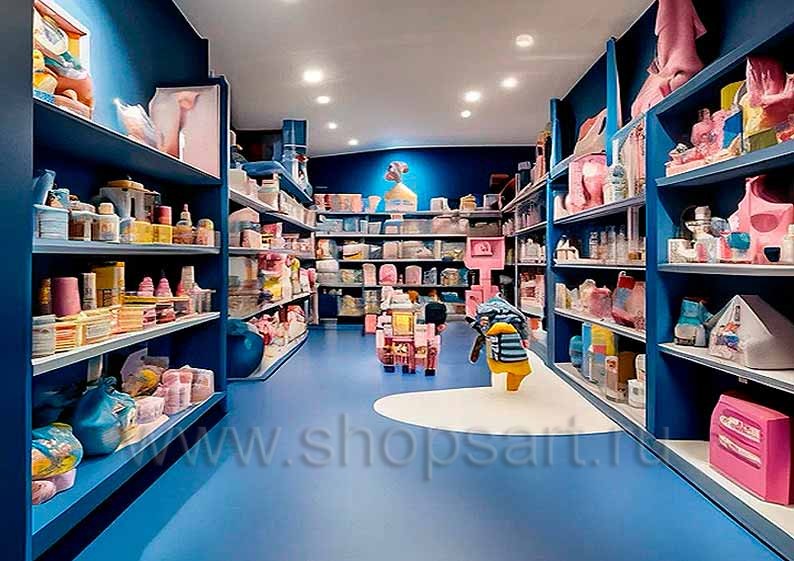 Отделку торгового зала желательно выполнить с применением сочных тонов. Даже если в целом для интерьера магазина использовались нейтральные или теплые оттенки, яркие штрихи в оформлении заведения точно не будут лишними. Уместно украсить стены торгового зала картинками на детскую тематику.