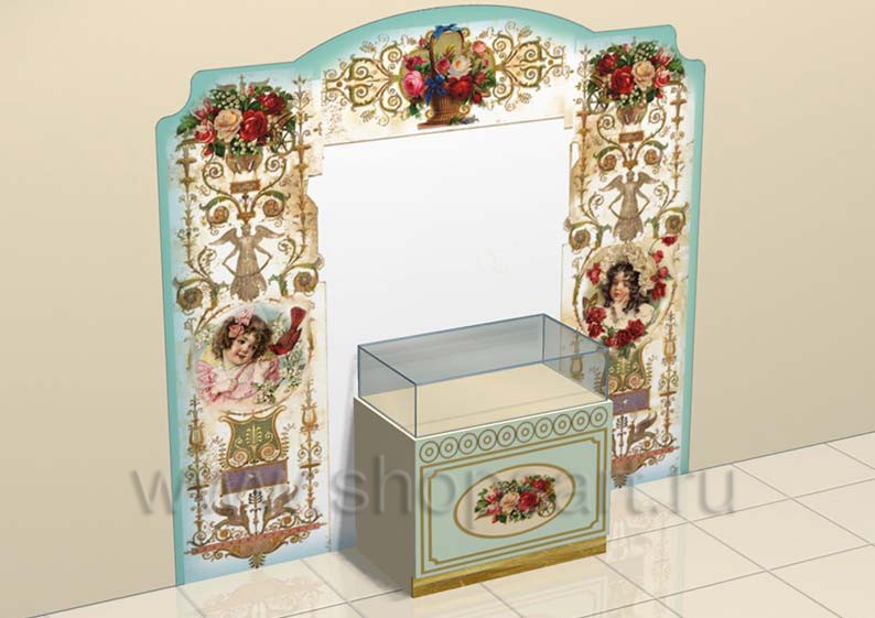 Коллекция «Винтаж» идеально подойдет для создания нежной атмосферы в торговом зале. Конструкции пастельных тонов с цветочным расписным декором смотрятся изящно и слегка сказочно. Для отделки цоколя применяется металлизированный пластик золотистого оттенка.