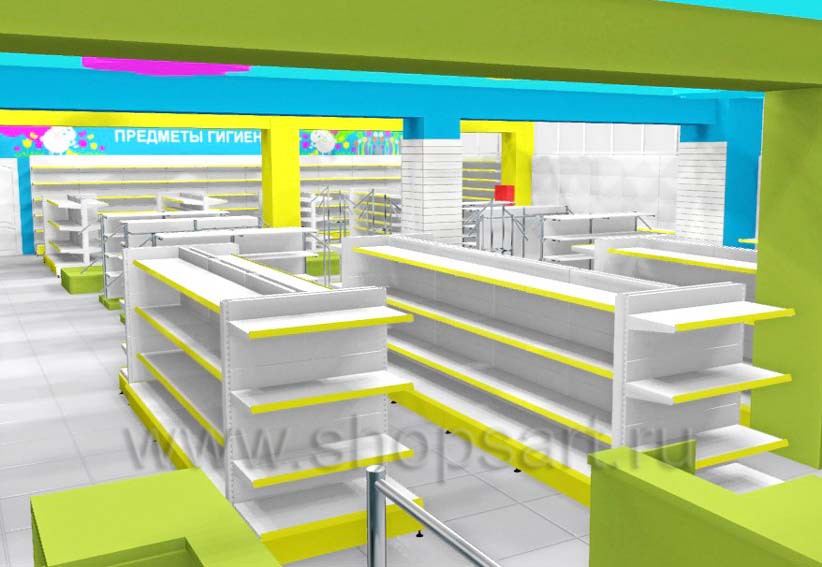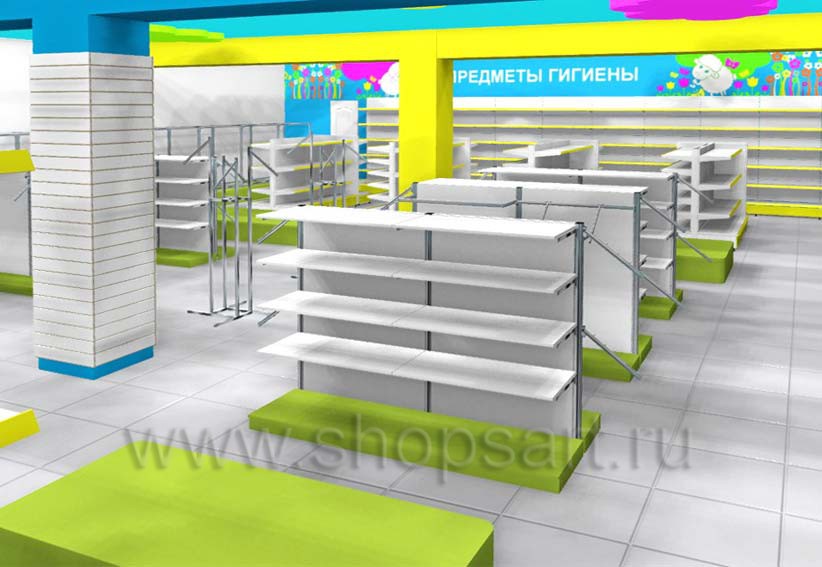 Торговое оборудование для детских магазинов на основе коллекции ЦВЕТНЫЕ МЕТАЛЛИЧЕСКИЕ СТЕЛЛАЖИ