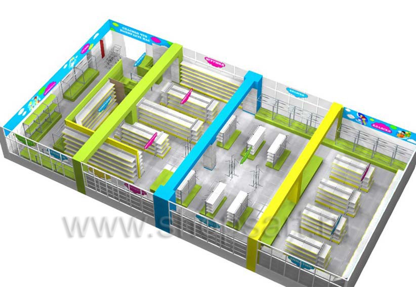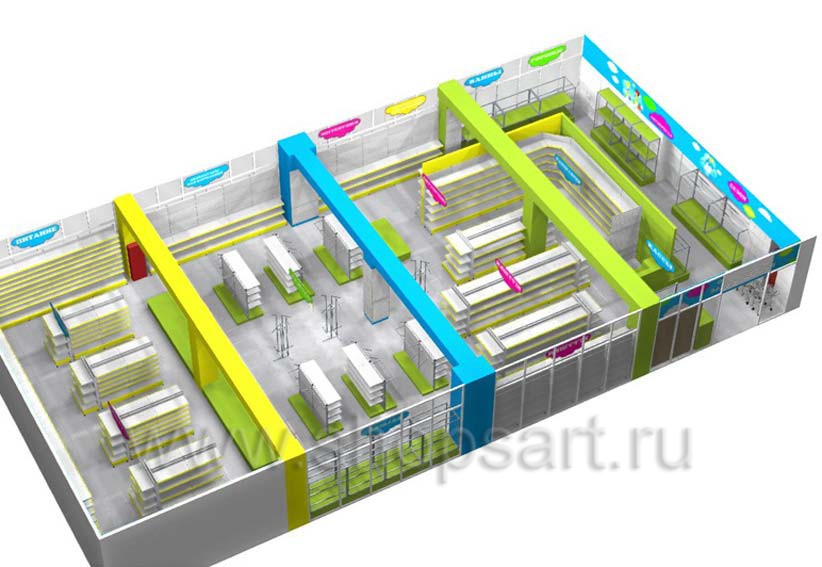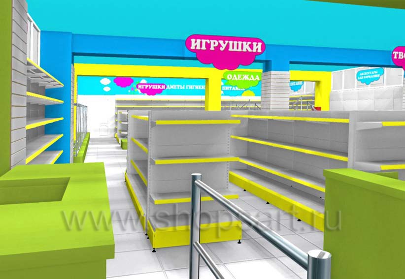 Как правило, при разработке дизайна детского магазина специалисты учитывают специфику представленной продукции и возрастную категорию детей, для которой она предназначена. Одна из ключевых задач дизайнеров заключается в рациональном использовании полезной площади коммерческого помещения. Обычно это достигается путем зонирования. Разделение торгового зала на зоны можно выполнить как по категориям детской продукции (игрушки, питание, одежда, обувь и т.д.), так и по возрастному, а также половому принципу (товары для новорожденных, детей дошкольного и школьного возраста, изделия для мальчиков и девочек).
