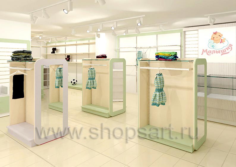 Фотографии торгового оборудования в открытом детском магазине “Baby Star”, г. Москва, ТЦ «Капитолий”, на основе коллекции «АКВАРЕЛИ»