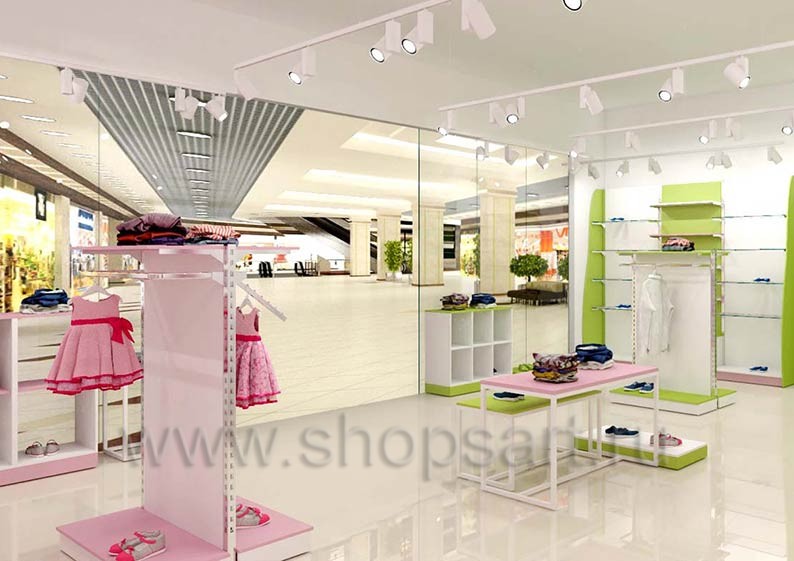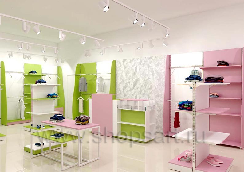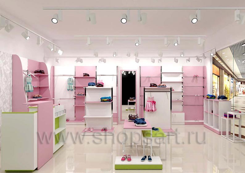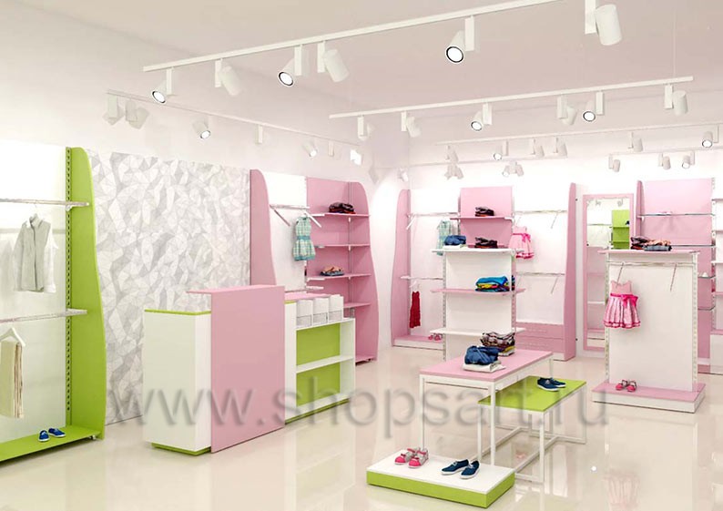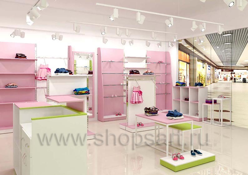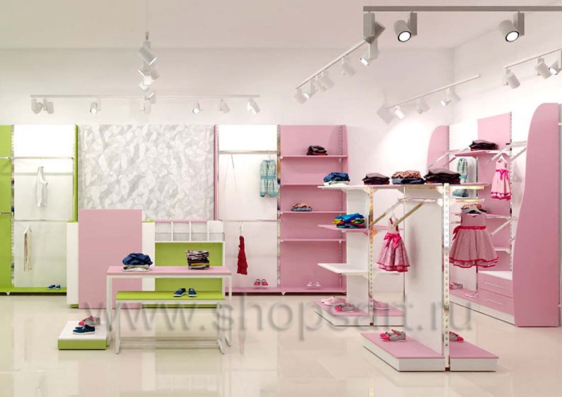 Фотографии торгового оборудования в открытом детском магазине “Бэби Бум”, г. Москва район Марьино, на основе коллекции «РОЗОВАЯ ФАНТАЗИЯ»