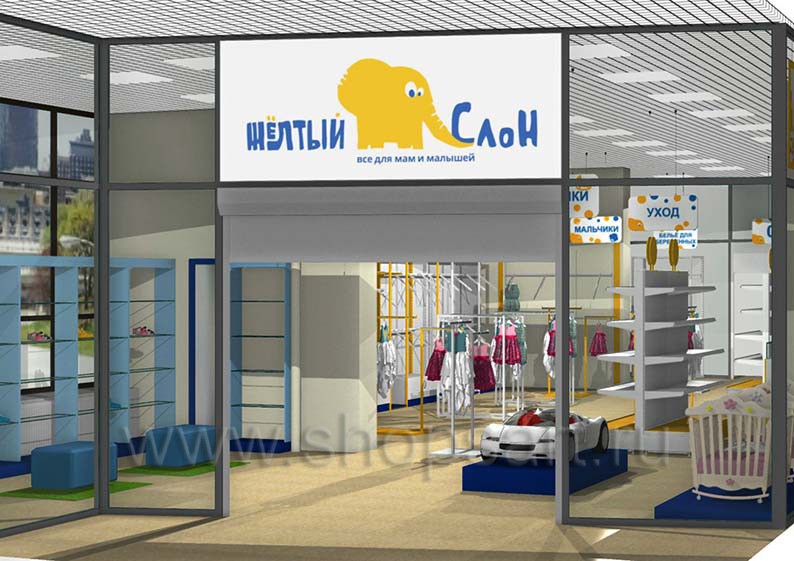 Дизайн-проект детского магазина “Жёлтый слон” г. Сургут, ТЦ “Браво”, на основе коллекции торгового оборудования “РАДУГА”