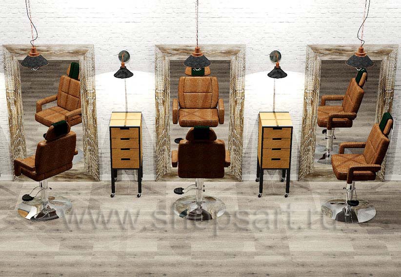 Мебель в таком салоне или парикмахерской отличается минимализмом и практичностью. Она изготовлена из натуральных материалов. Для хранения инструментов подготовлены специальные тумбы с ящиками со стальным каркасом. Кресла для посетителей — классические, с подлокотниками и функцией вращения. В их основе тоже стальной каркас. В обстановке использованы зеркала во всю стену и практичные светильники.