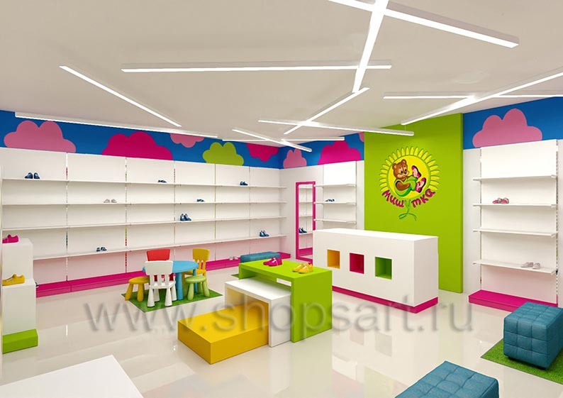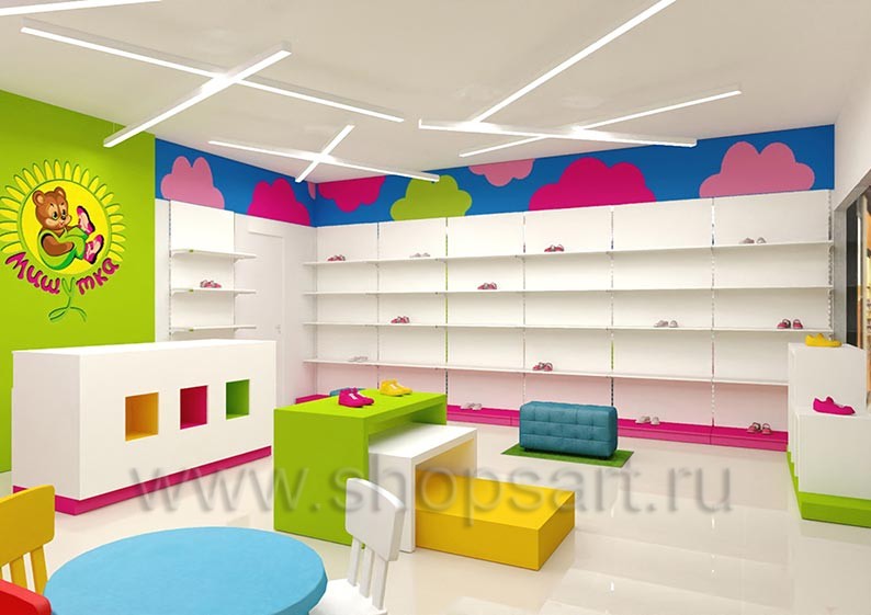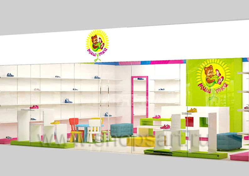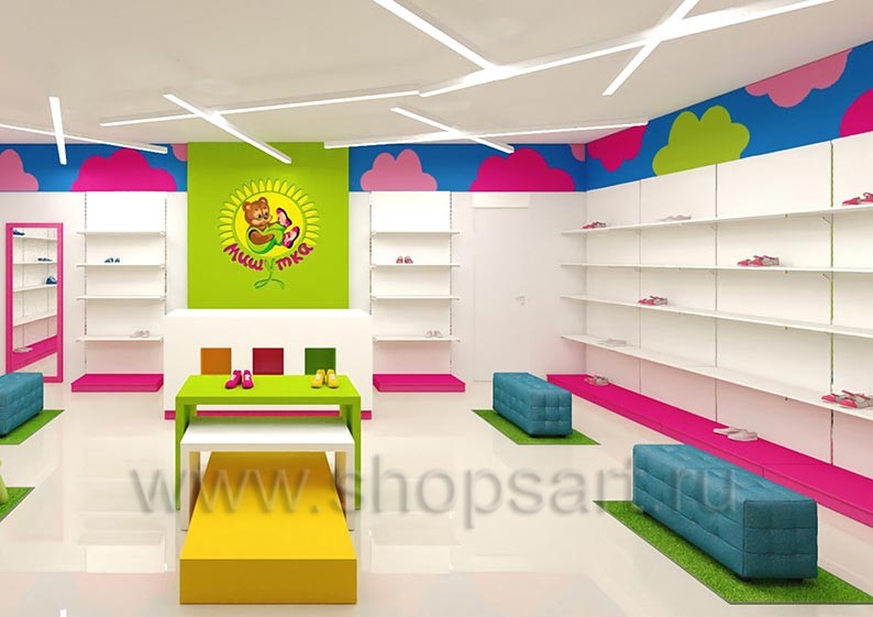 Меблировка торгового заведения, реализующего обувь для детей, включает в себя: