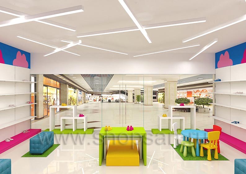 Стоит отметить, что удачно подобранный дизайн магазина обуви создает атмосферу, вдохновляющую посетителей на совершение покупок. Когда дети и взрослые видят яркий, пестрящий сочными оттенками интерьер в торговом зале, они проникнутся желанием подольше находиться в такой приятной обстановке и наверняка покинут заведение с обновками. Гармония цветовых сочетаний с декоративными элементами и оригинальной меблировкой имеет беспроигрышный эффект. Эксклюзивный интерьер магазина обуви поможет презентовать товары красиво. Особенно актуальна задача привлечения покупателей в заведениях, реализующих изделия для детей. Малыши не любят скуку. Им нравится проводить время в интересных местах, и владелец магазина, желающий привлечь побольше клиентов, должен обеспечить юным посетителям интересный досуг.