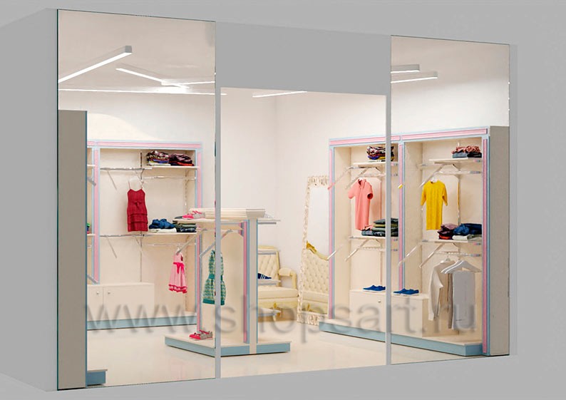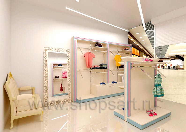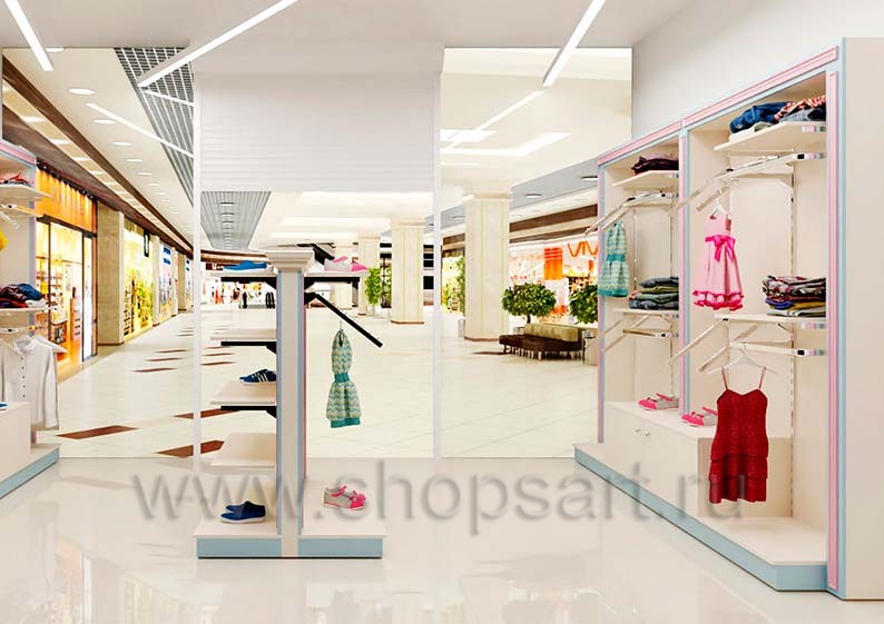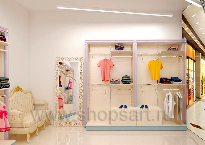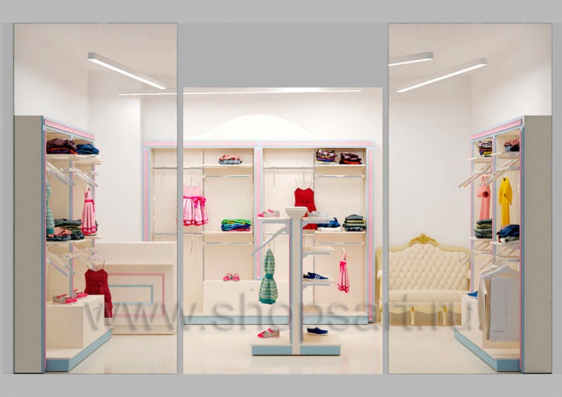 - Дизайн детского магазина одежды предполагает грамотную выкладку и развешивание изделий. Для выполнения этой задачи понадобится соответствующее торговое оборудование.