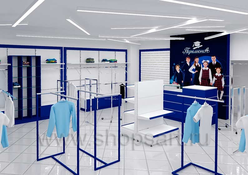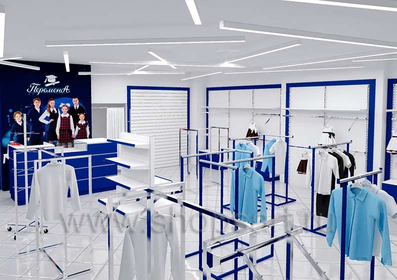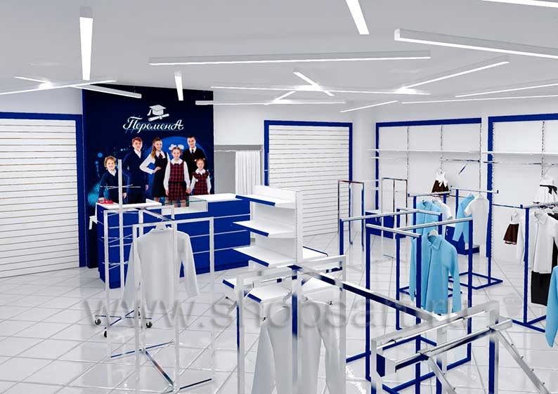 На этой странице Вы можете ознакомиться с дизайном интерьера и дизайном торговой мебели магазина детской одежды и школьной формы “Перемена”, находящегося в ТРЦ «Азовский» г. Москва, ул. Азовская, дом 25, корпус 3, на основе коллекции торгового оборудования «ГОЛУБАЯ ЛАГУНА». Разработала дизайн магазина одежды и дизайн торговой мебели компания ООО «Искусство интерьеров». Узнать больше о наших коллекциях оборудования для одежды Вы можете на странице торговой мебели для магазинов одежды.