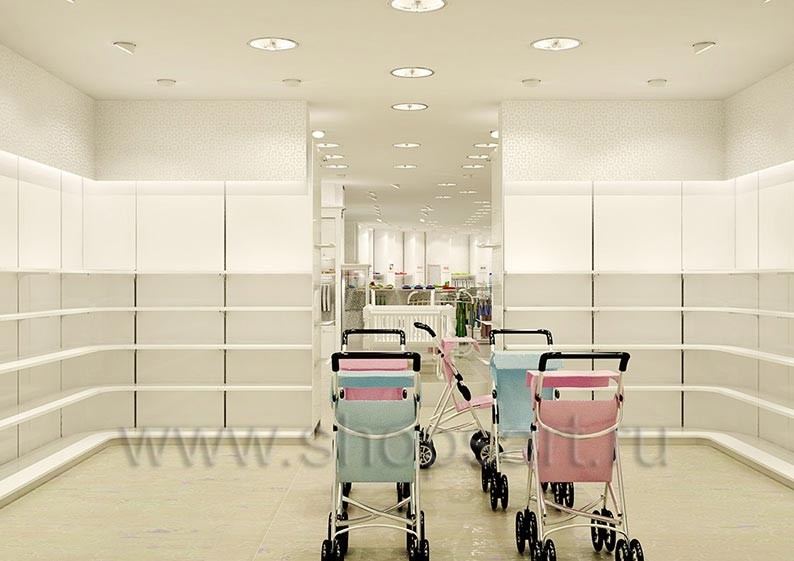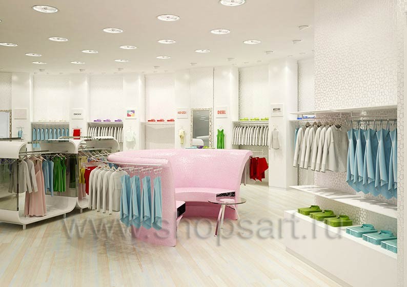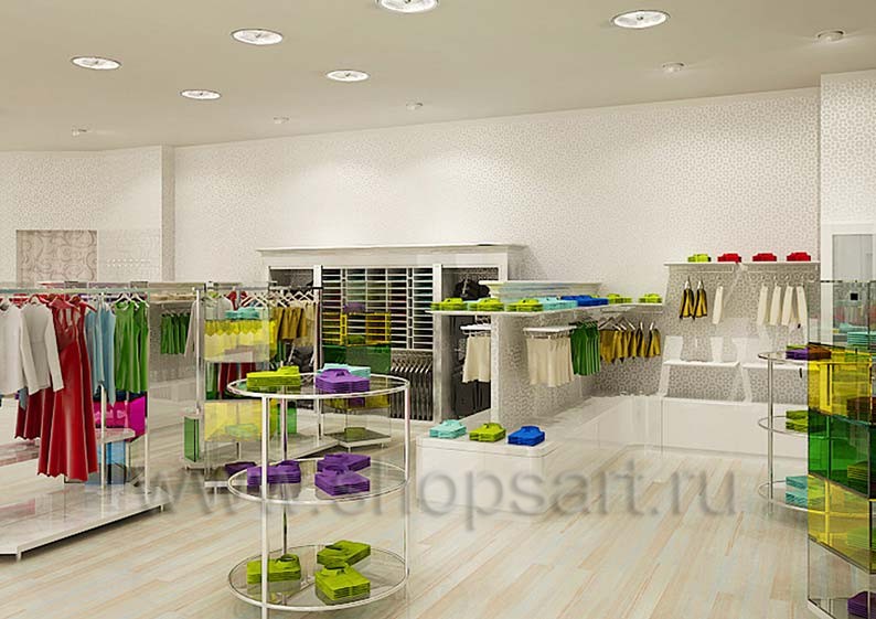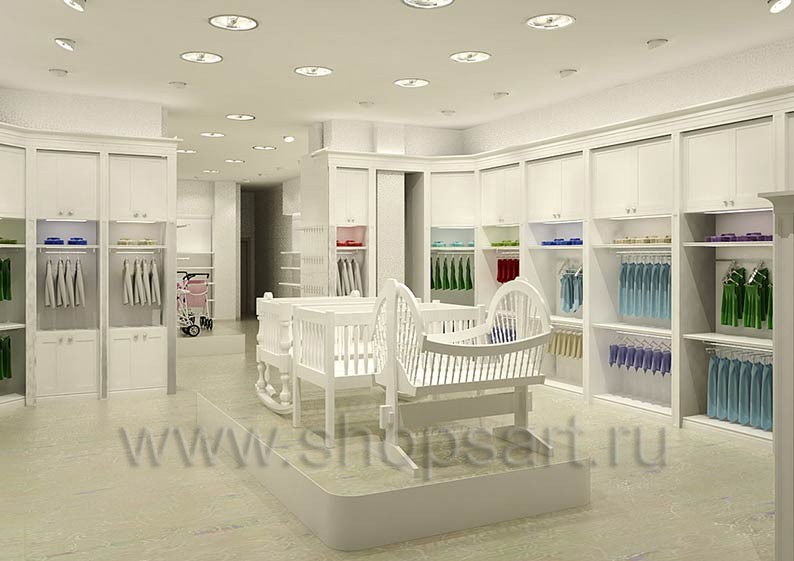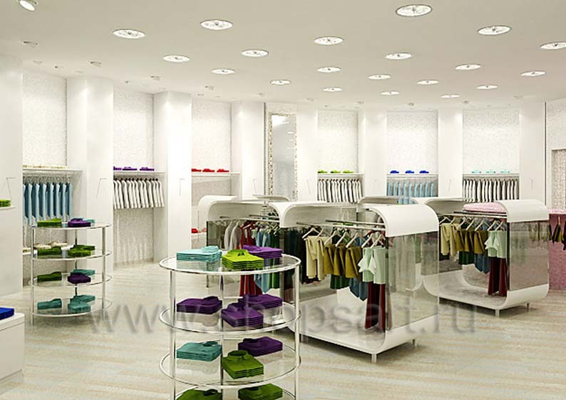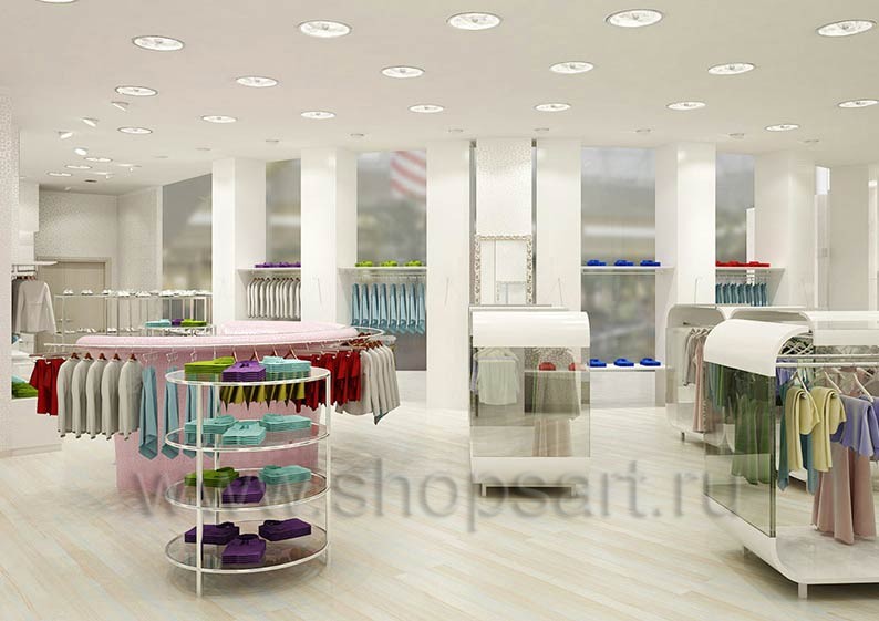- Акцентировать внимание покупателей на представленной в магазине одежде. Когда торговая мебель оснащена подсветкой, размещенные на ней изделия смотрятся выигрышно и очень привлекательно. Такое оборудование для одежды обеспечит эффектную демонстрацию товаров, что немаловажно для развития бизнеса. Специалисты считают, что освещенность торговых конструкций должна быть ярче общего света в коммерческом помещении примерно на 30-40%. Если дизайн магазина детской одежды выполняют профессионалы, то они непременно учтут этот нюанс.