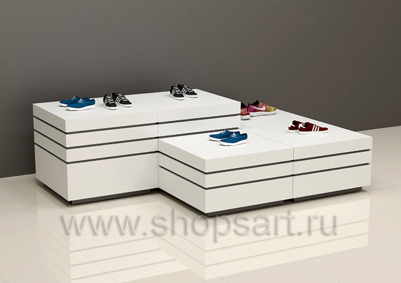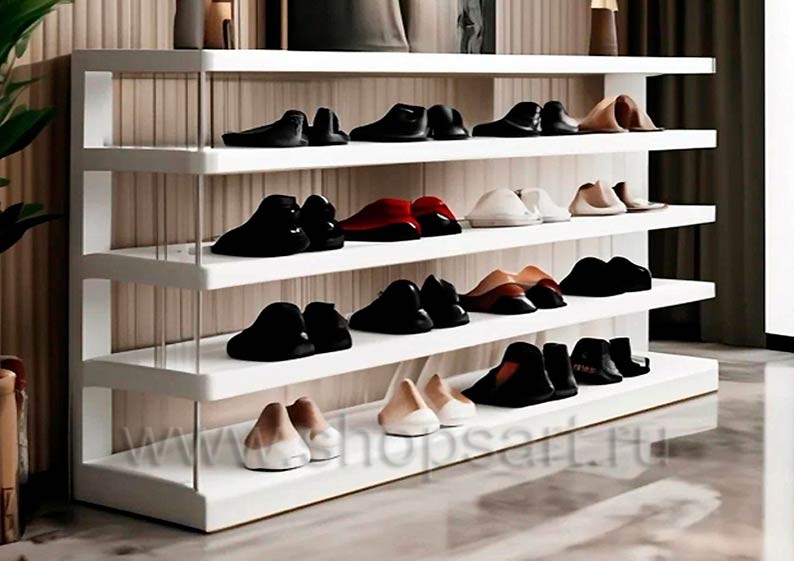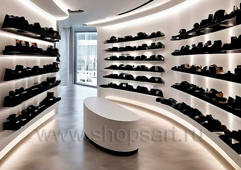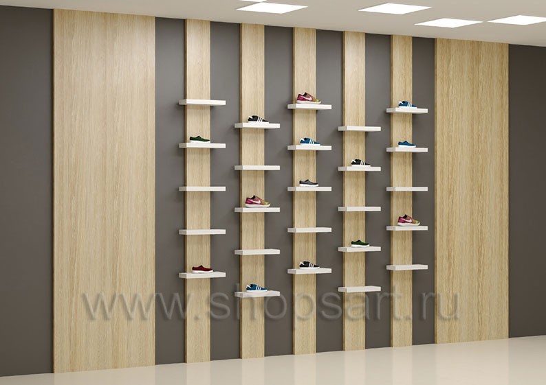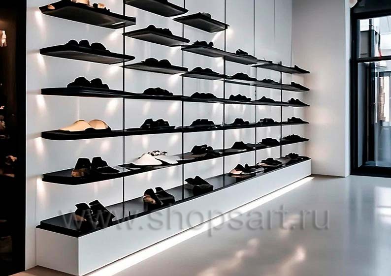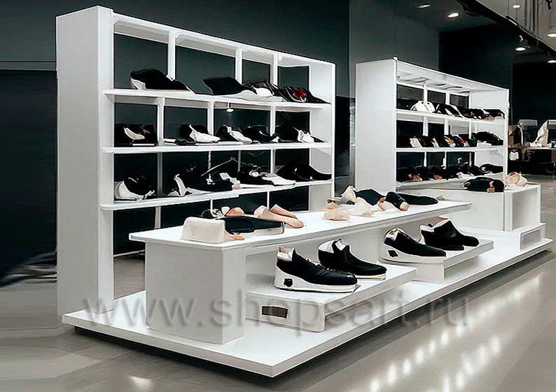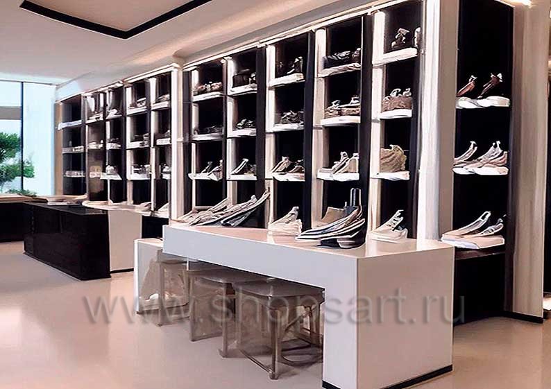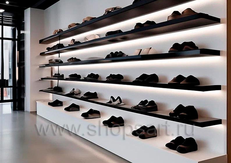 Функциональное оснащение является ключевой фигурой в оформлении заведения, реализующего обувь. В частности, для демонстрации такого товара применяются конструкции следующих типов: