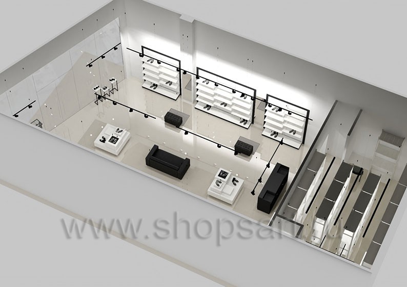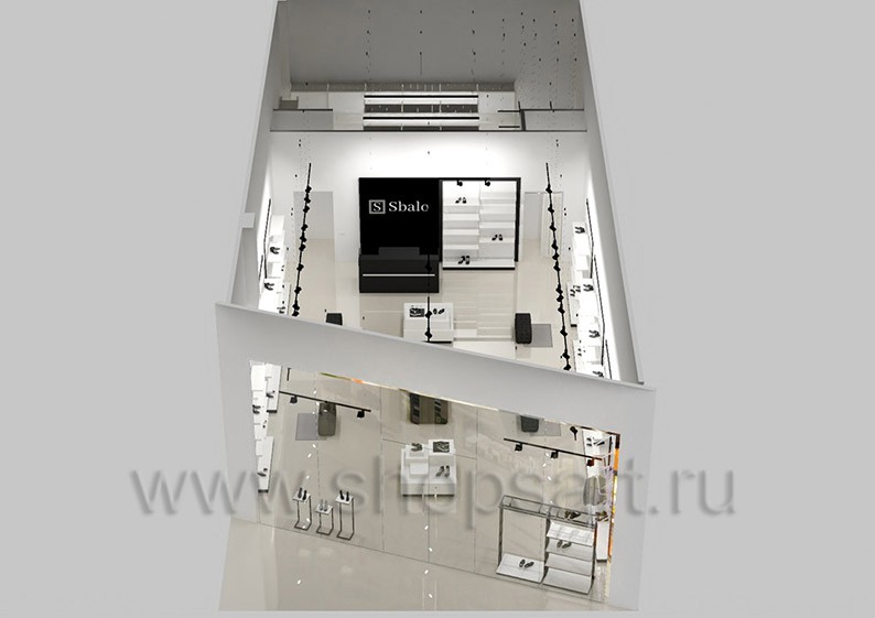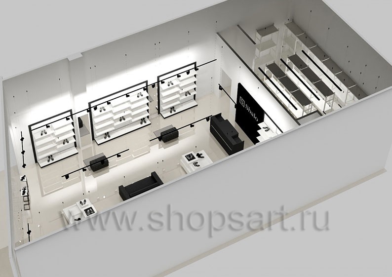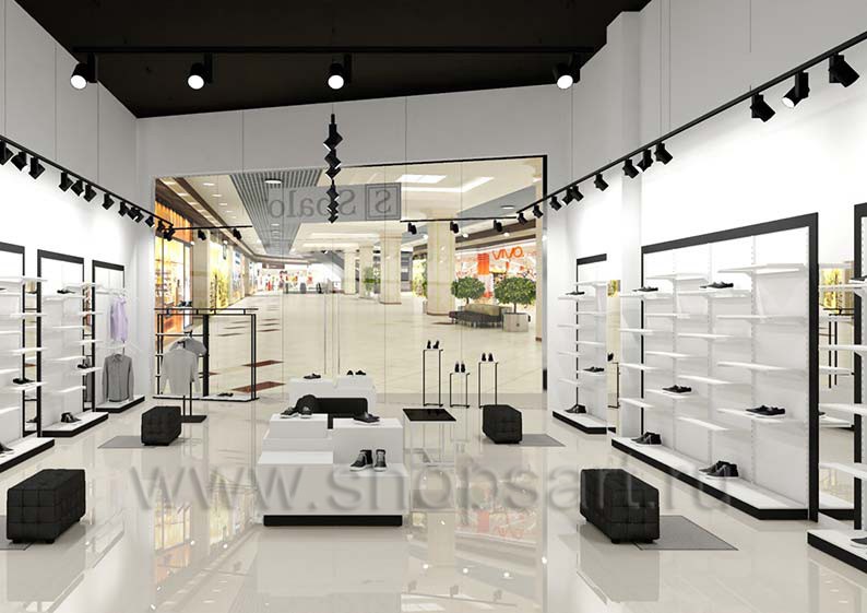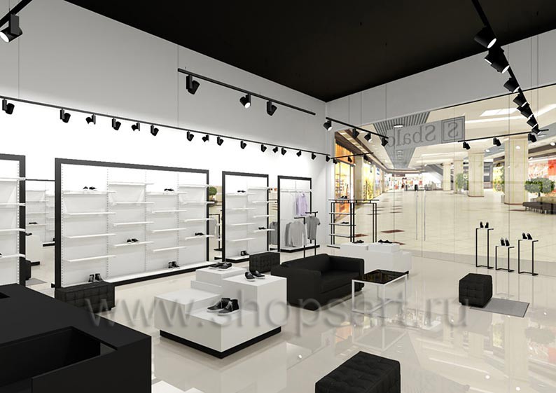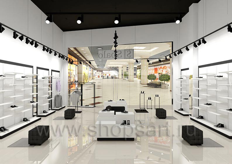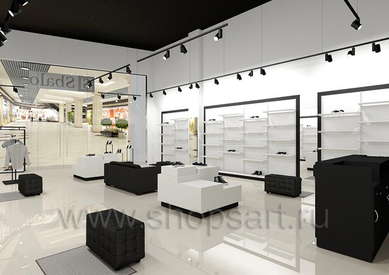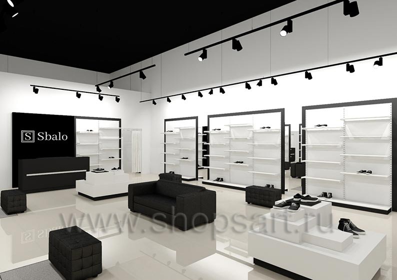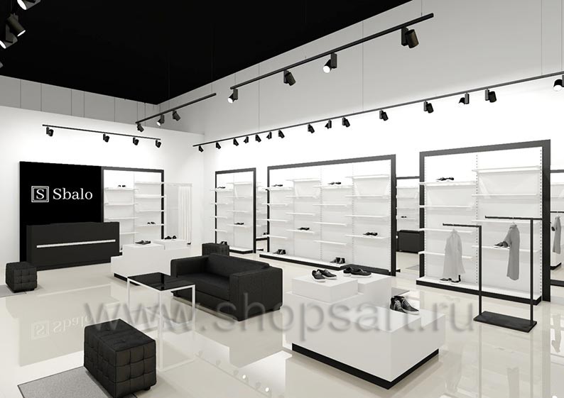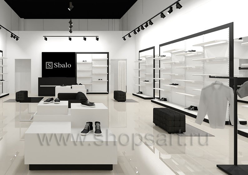 Дизайн-проект магазина одежды и обуви «Sbalo» г. Москва, ТРК Европолис на основе торгового оборудования “ЧЁРНО-БЕЛАЯ КЛАССИКА”