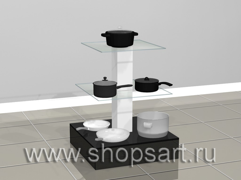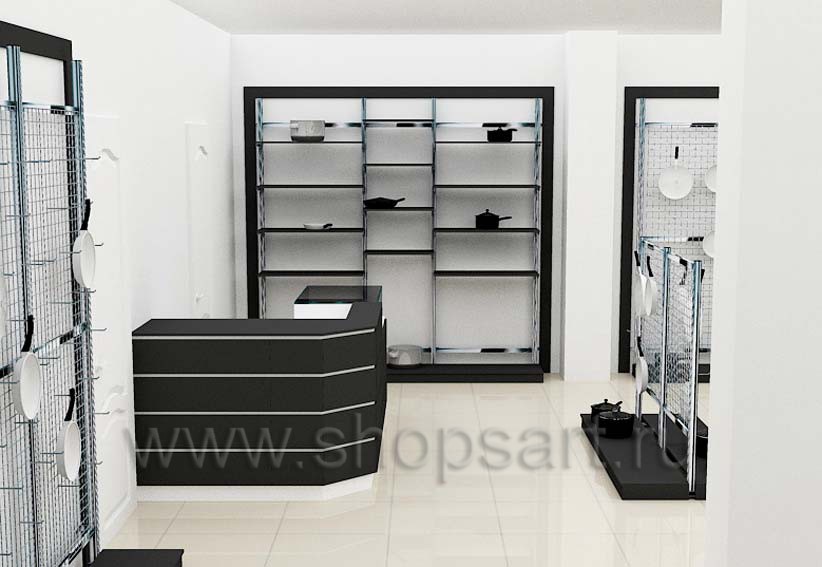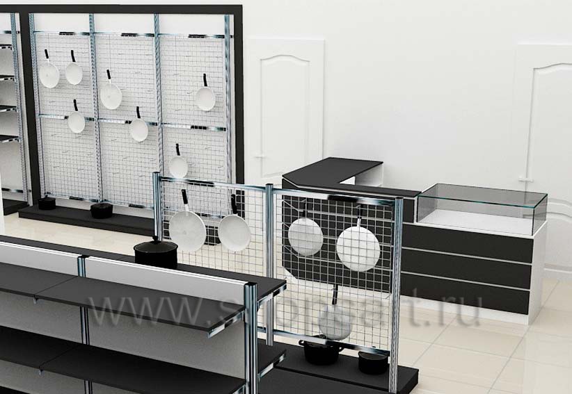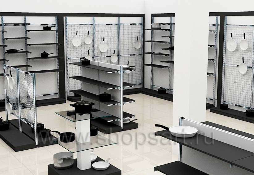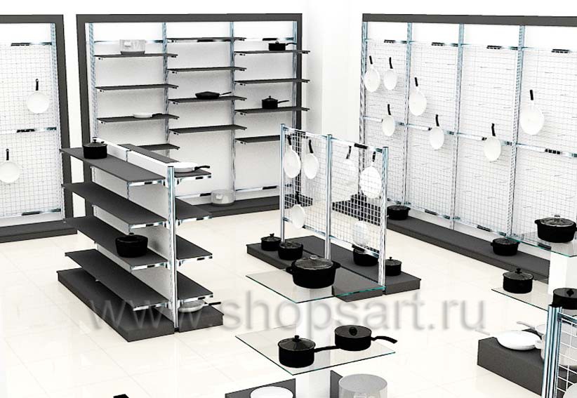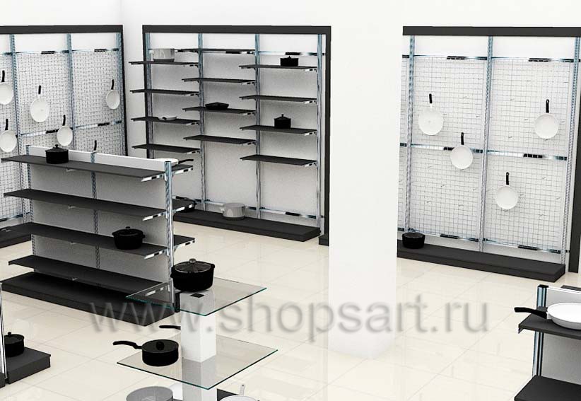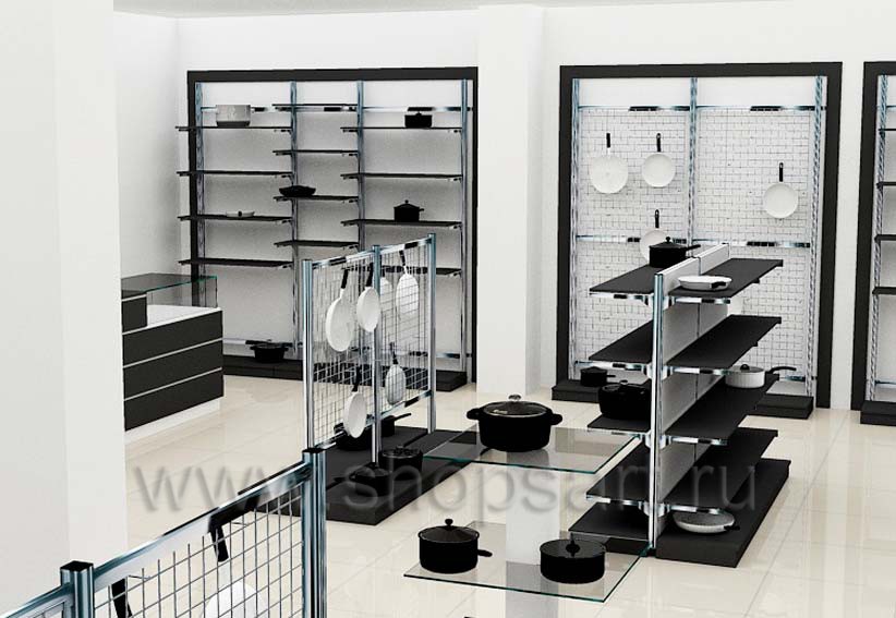 Торговые стеллажи используются для размещения и презентации наиболее ходовых изделий. Витрины применяют для демонстрации дорогой посуды. Прилавки удобны для размещения столовых приборов.