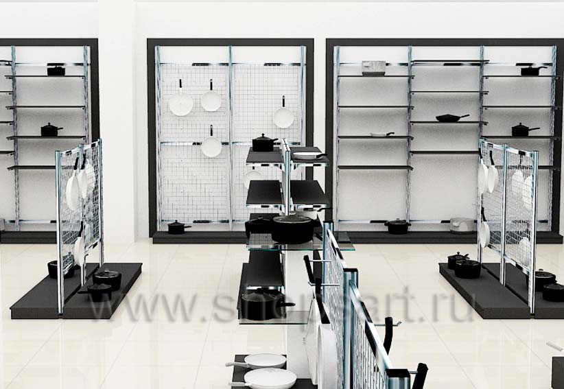 Предлагаем вашему вниманию оригинальное интерьерное решение, которое преобразит магазин. Коллекция оборудования «Мебель для посуды» выполнена в контрастных цветовых решениях. Здесь использованы во все времена актуальные цвета – белый и чёрный. Они обеспечат презентабельность торговому объекту и выгодно подчеркнут преимущества представленных изделий. Данная коллекция была разработана специально для заведений, реализующих посуду. Поэтому она отлично подходит для оснащения магазинов данной направленности. Это торговое оборудование можно использовать для презентации кастрюль, сервизов, изделий из хрусталя, столовых приборов, различной кухонной утвари. Только посмотрите, каким стильным и гармоничным получился дизайн интерьера магазина посуды BergHOFF Воронеж коллекция Мебель для посуды.