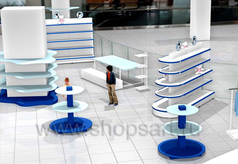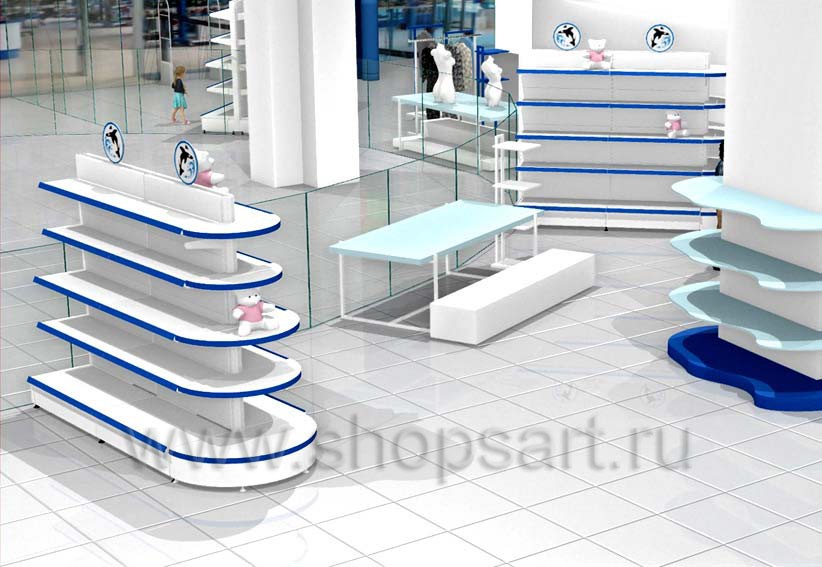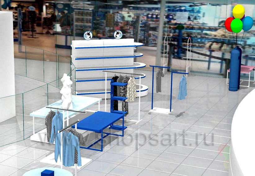 Фотографии торгового оборудования открытого магазина детских товаров в ЖК “Green park”, г. Москва, на основе коллекции «ЦВЕТНЫЕ МЕТАЛЛИЧЕСКИЕ СТЕЛЛАЖИ»