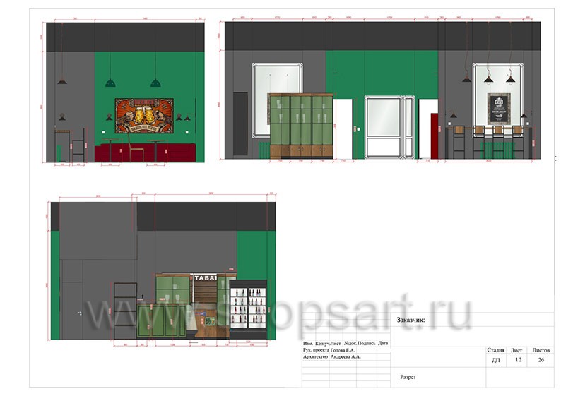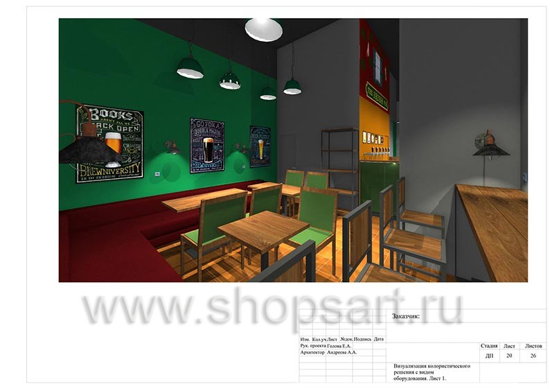 При входе в бар, по бокам, устанавливаются холодильники с пивом, по передней стене – барная стойка. Зона со столиками для гостей расположена слева. С правой стороны табачная зона и зона аксессуаров. В дальнем, правом углу располагается туалетная комната. За барной стойкой – помещение холодильника. В дальнем левом углу, за холодильником, располагается подсобное помещение. Между туалетной комнатой и холодильником запроектирована проходная комната, которая ведет на второй этаж в кабинет директора.