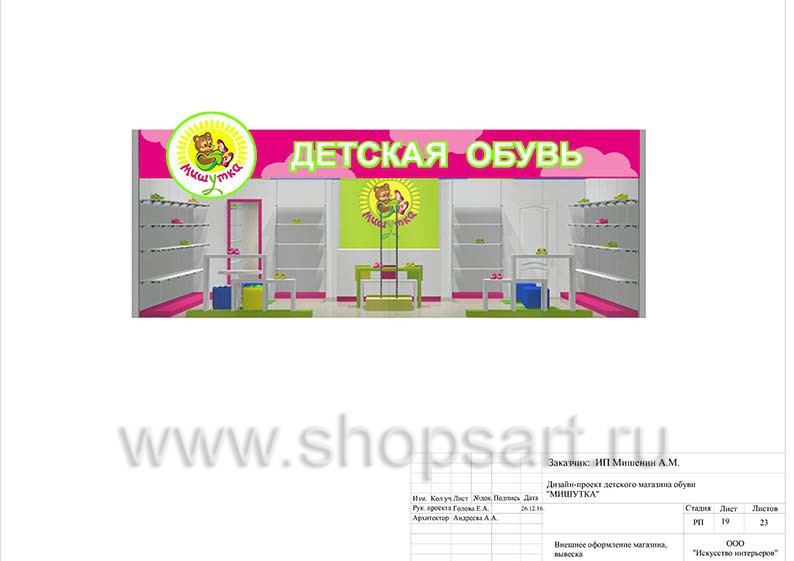 Дизайн помещения детского магазина обуви «МИШУТКА», разработан на основе выбранного стиля компании, с использованием приемов и решений, выгодно преподносящих покупателю обувь.