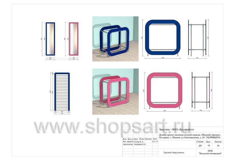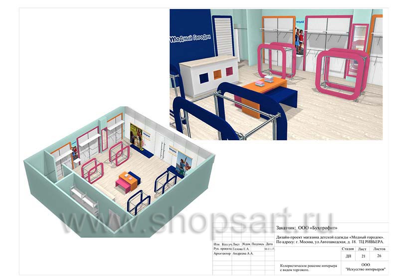 На этой странице Вы можете ознакомиться с дизайн-проектом детского магазина «Модный Городок», находящегося в ТЦ “Ривьера”, город Москва, улица Автозаводская, дом 18, на основе коллекции торгового оборудования «ГОЛУБАЯ ЛАГУНА». В магазине представлена брендовая одежда испанской торговой марки «MAYORAL». Разработала дизайн-проект магазина, дизайн интерьера и дизайн торговой мебели компания «Искусство интерьеров». Узнать больше о наших коллекциях оборудования для детских магазинов Вы можете на странице торгового оборудования для детских магазинов.