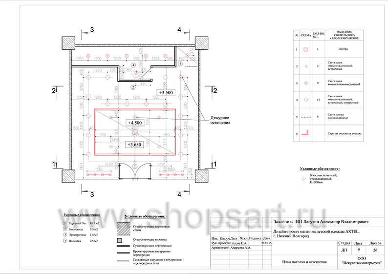 - Правильное освещение коммерческого объекта является залогом эффектной презентации товаров. Именно поэтому дизайнеры в обязательном порядке вносят схему размещения осветительных приборов в проект магазина детской одежды.
