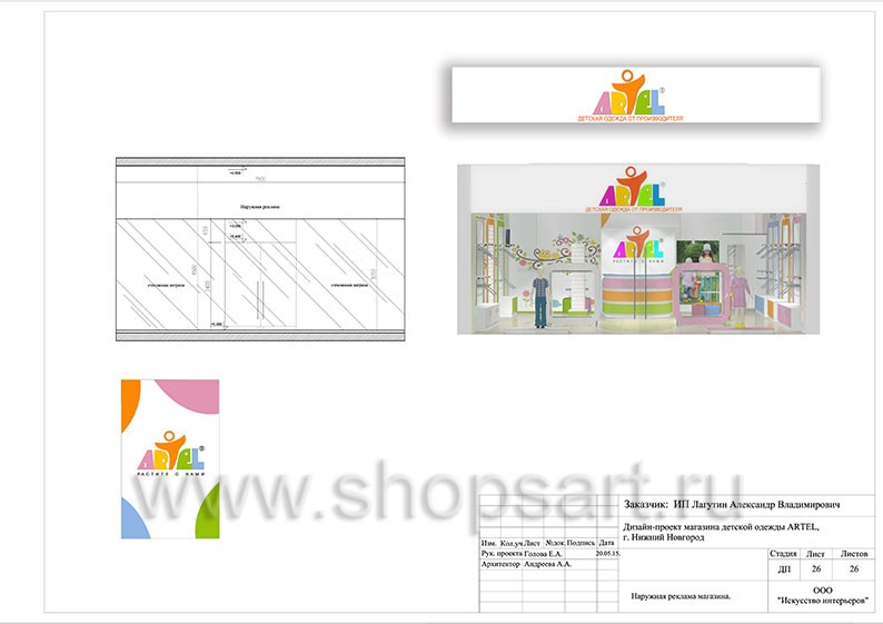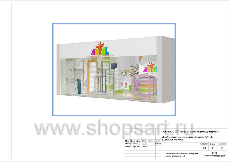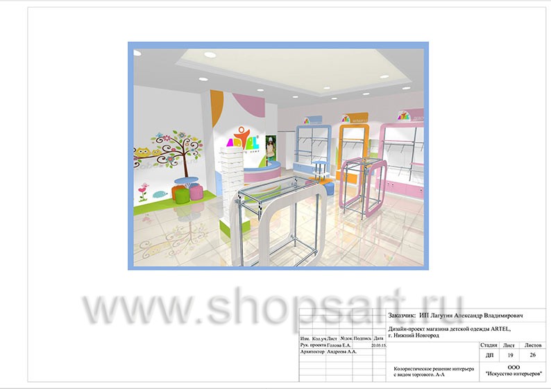 Дизайн помещения магазина детской одежды «АRTEL», находящегося в г. Нижний Новгород, разработан на основе выбранного стиля компании, с использованием приемов и решений, выгодно преподносящих покупателю детскую одежду.