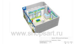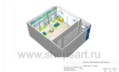 Торговое оборудование спроектировано в виде пристенных стеллажей со стеклянными полками толщиной 8мм., предназначенными для выкладки обуви. Задние стенки торговых стеллажей выполняются из белого ЛДСП, боковые стенки и нижние части подиумов изготавливаются из голубого ЛДСП, цвет которого подчеркивает представленную вдоль стен обувь. В центральной части торгового зала устанавливаются демонстрационные островные конструкции. Вдоль пристенных стеллажей располагаются удобные пуфы, стоящие на салатовых ковриках. В дальней части магазина располагается подсобное помещение. Кассовый стол устанавливается в дальней левой части магазина на фоне фирменной стены с логотипом. На фирменной стене крепится логотип.