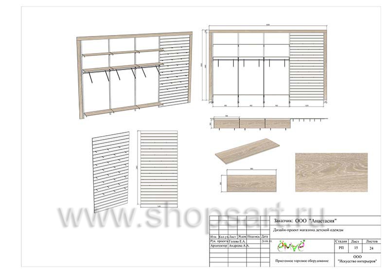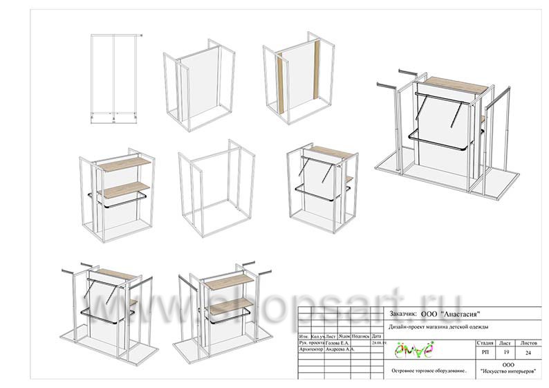 Торговое оборудование выполнено в виде пристенных стеллажей с рамками из ЛДСП. Металлические стойки, крепящиеся на стену, имеют разнообразные кронштейны для выкладки и навески детской одежды. В центральной части торгового зала устанавливаются демонстрационные островные конструкции.