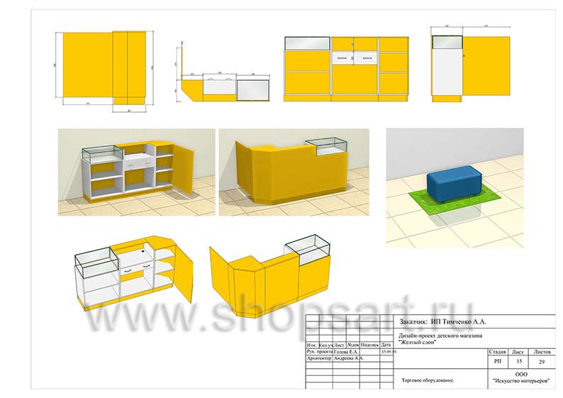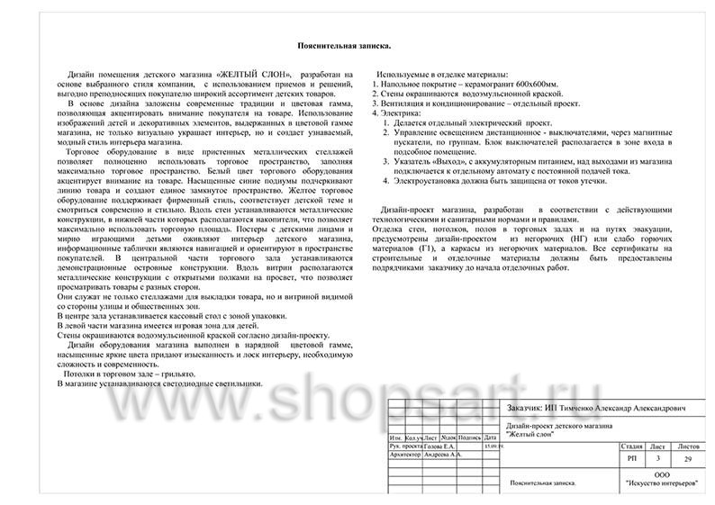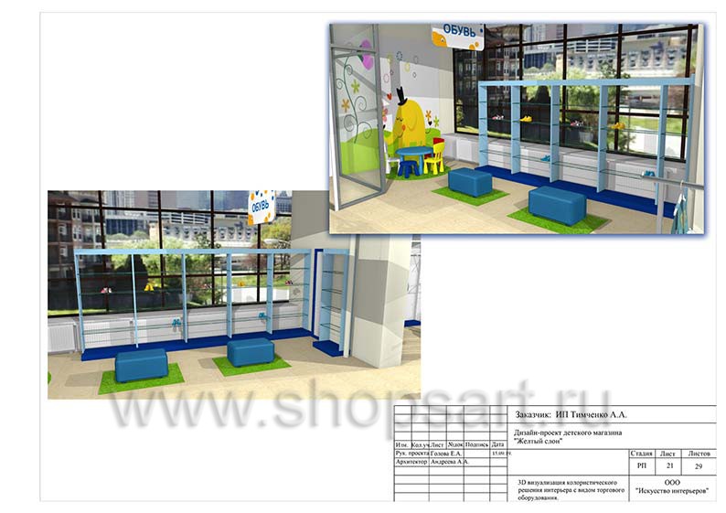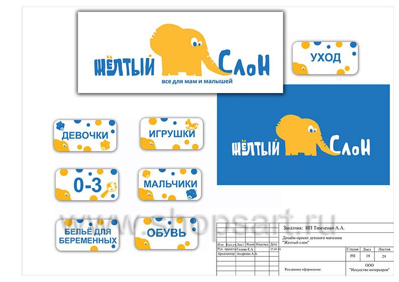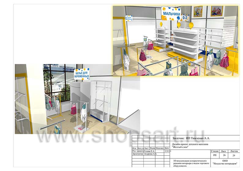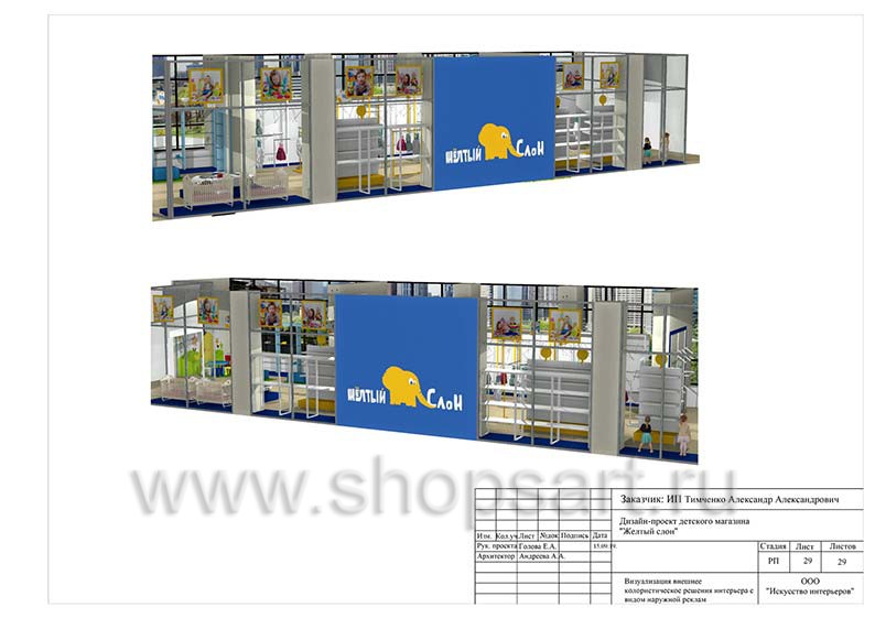 Дизайн помещения детского магазина «ЖЕЛТЫЙ СЛОН», разработан на основе выбранного стиля компании, с использованием приемов и решений, выгодно преподносящих покупателю широкий ассортимент детских товаров.