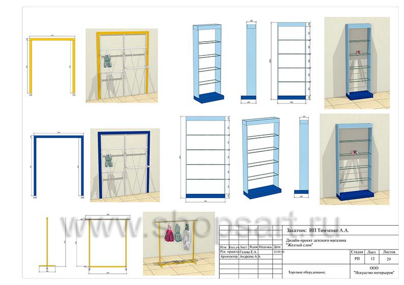 - Следующая стадия предполагает создание креативной концепции интерьера торгового объекта и зонирование территории магазина. На этом этапе специалисты разрабатывают несколько вариантов цветовых сочетаний и стилевых решений, которые предоставляются на выбор заказчику. Также они выбирают подходящую торговую мебель. Проект магазина детской одежды бывает: как бюджетным (для предоставления в торговый центр), так и расширенным (как правило создается для магазинов большой площади с большим количеством и разнообразием продаваемой продукции).