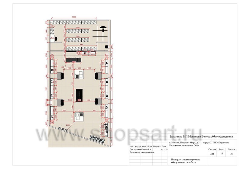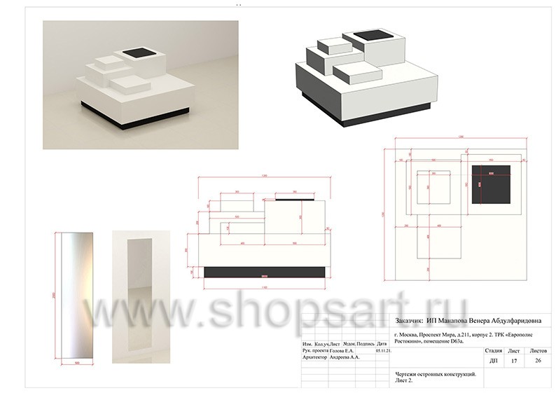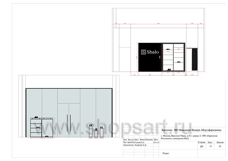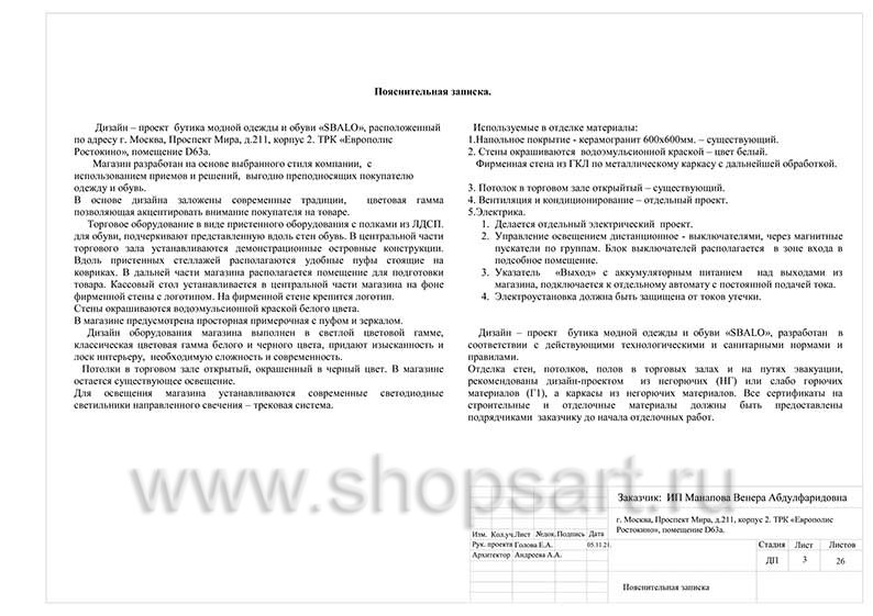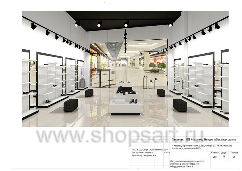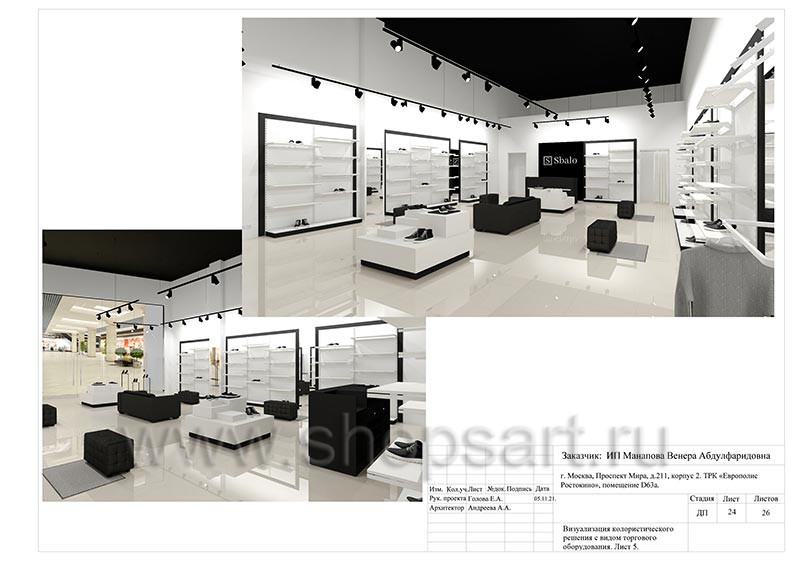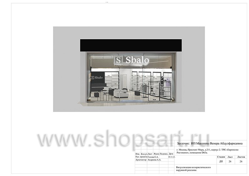 Дизайн–проект бутика модной одежды и обуви «SBALO», расположенный по адресу г. Москва, Проспект Мира, д.211, корпус 2, ТРК «Европолис Ростокино», помещение D63а.