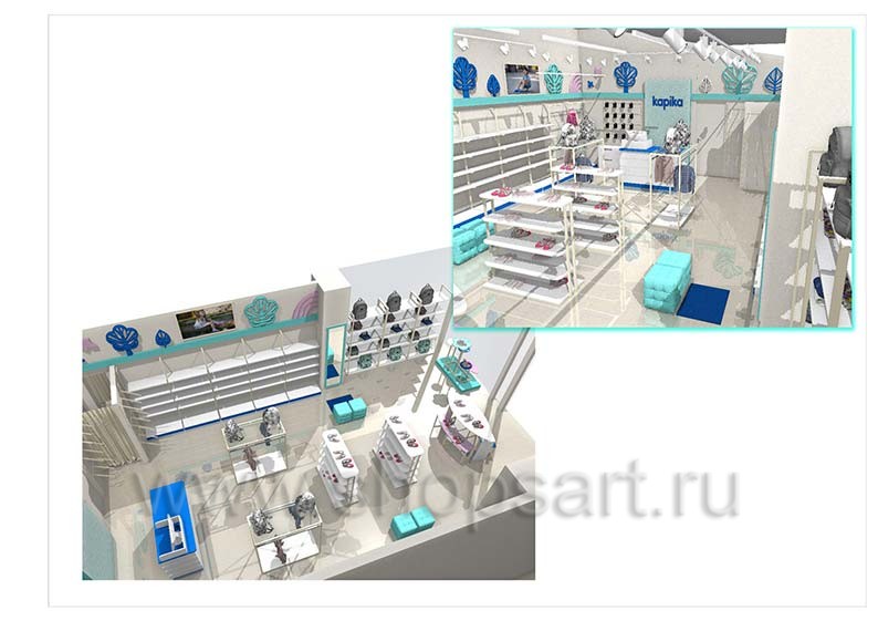 На этой странице Вы можете ознакомиться с дизайн-проектом для сетевого детского магазина «Kapika», находящегося в ТЦ “Горизонт”, город Ростов-на-Дону, проспект Михаила Нагибина, дом 32, на основе коллекции торгового оборудования «РАДУГА». Разработала дизайн-проект магазина, дизайн интерьера и дизайн торговой мебели компания «Искусство интерьеров». Узнать больше о наших коллекциях мебели для детских магазинов Вы можете на странице детского торгового оборудования.