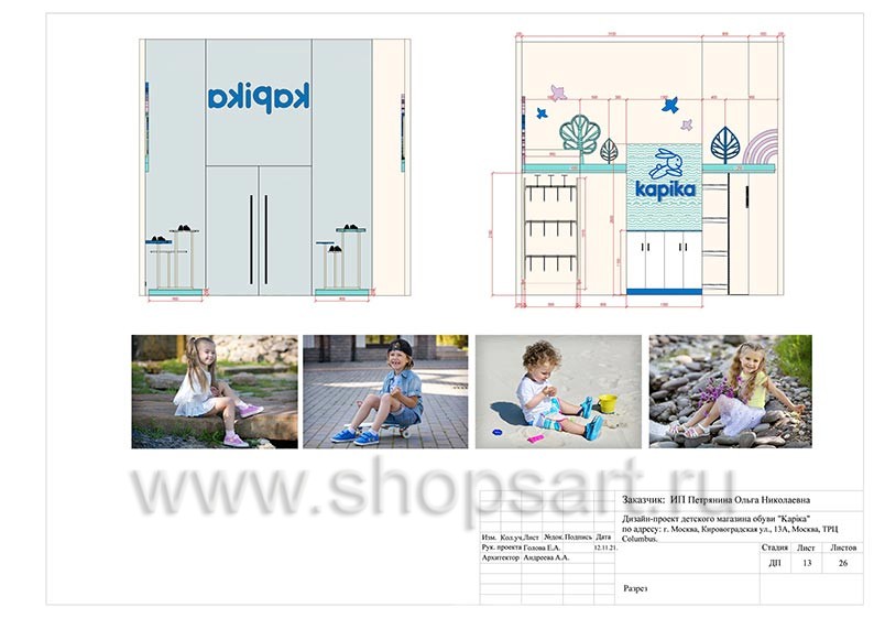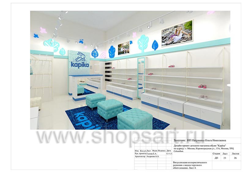 Дизайн помещения детского магазина «Kapika», разработан на основе выбранного стиля компании, с использованием приемов и решений, выгодно преподносящих покупателю модную детскую обувь и одежду.