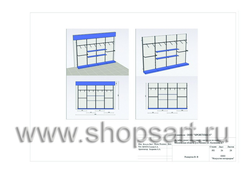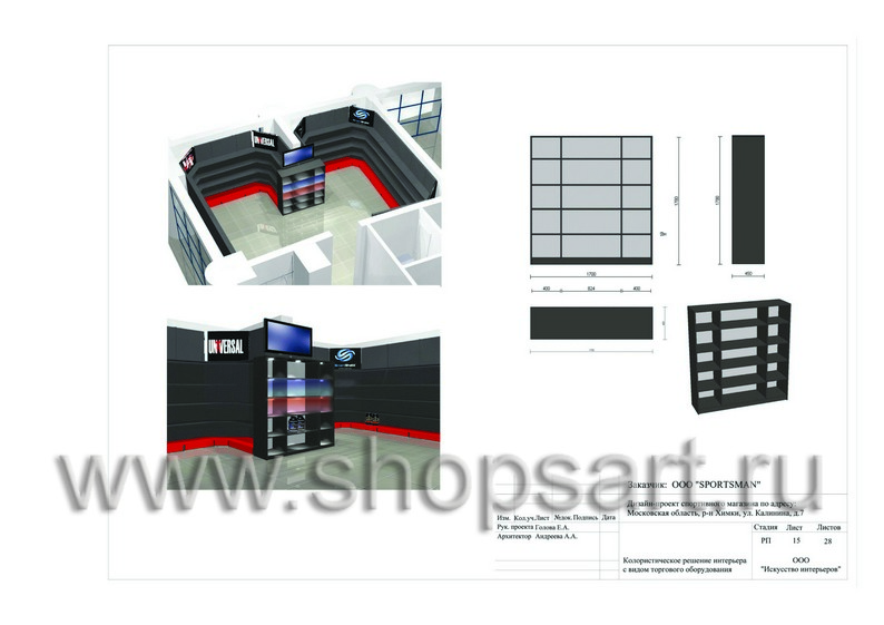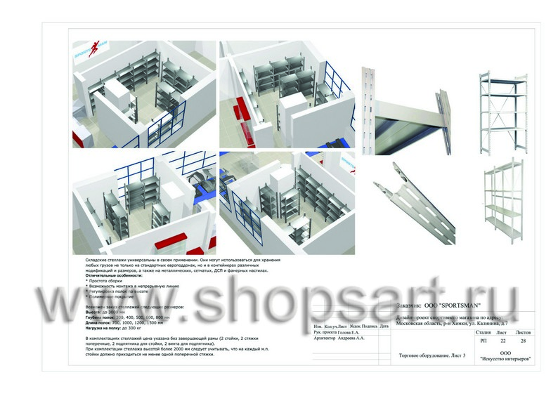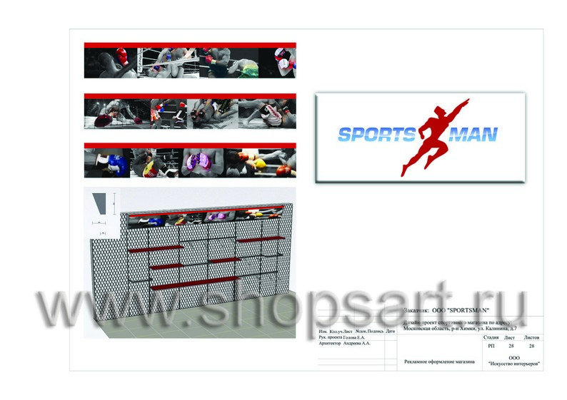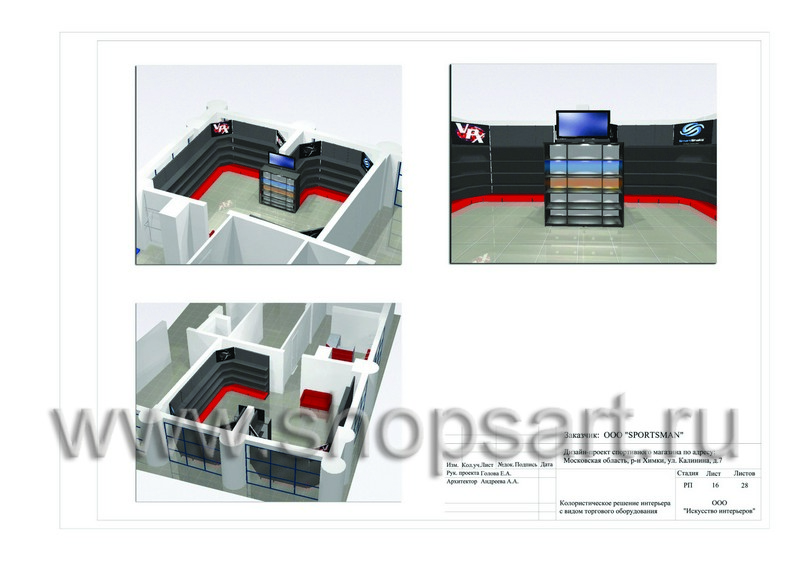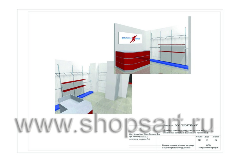 На этой странице Вы можете ознакомиться с дизайн-проектом для магазина спортивной одежды и питания для спортсменов “SPORTSMAN”, находящегося в городе Химки, улица Калинина, дом 7, Московской области, на основе коллекции торгового оборудования «АТЛАНТ”. Разработала дизайн-проект магазина, дизайн интерьера и дизайн торговой мебели компания ООО «Искусство интерьеров». Узнать больше о наших коллекциях мебели для магазина одежды Вы можете на странице оборудования для магазина одежды.