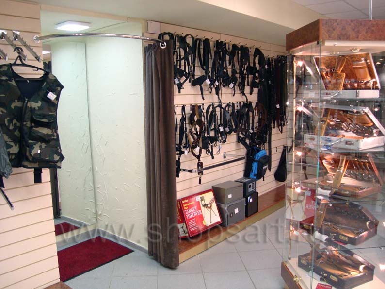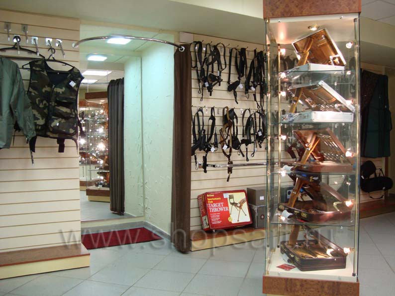 - Торговое оборудование коллекции ОХОТА И РЫБАЛКА зал одежды для оружейного салона На Люсиновской. Фото 01.