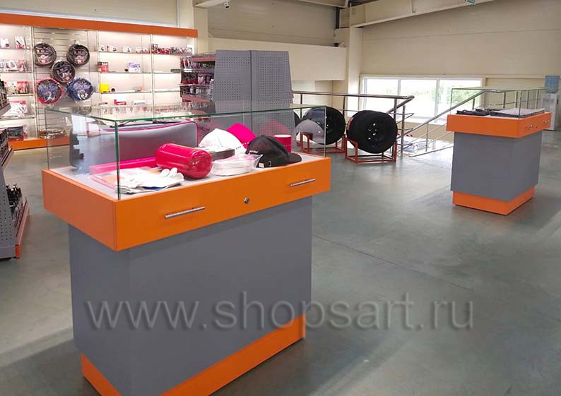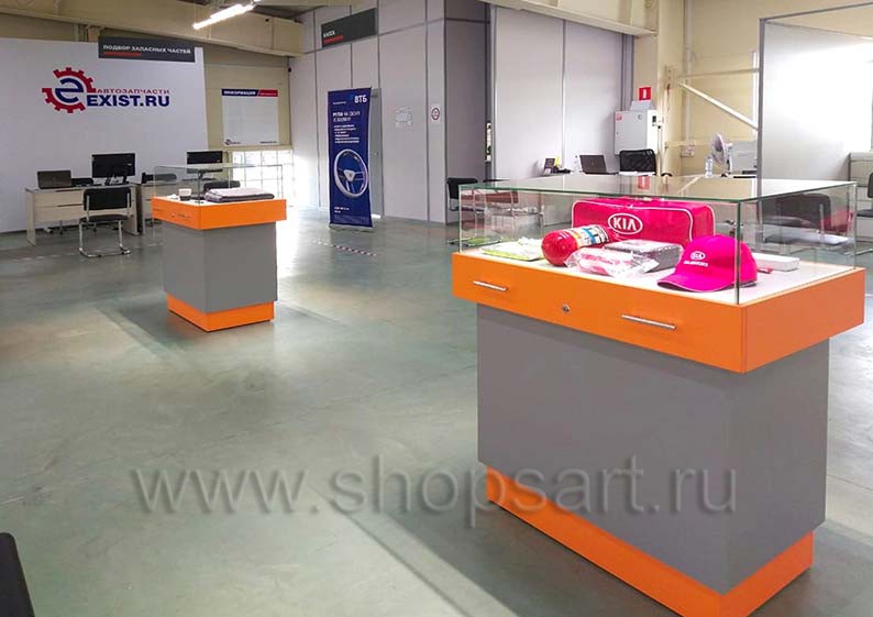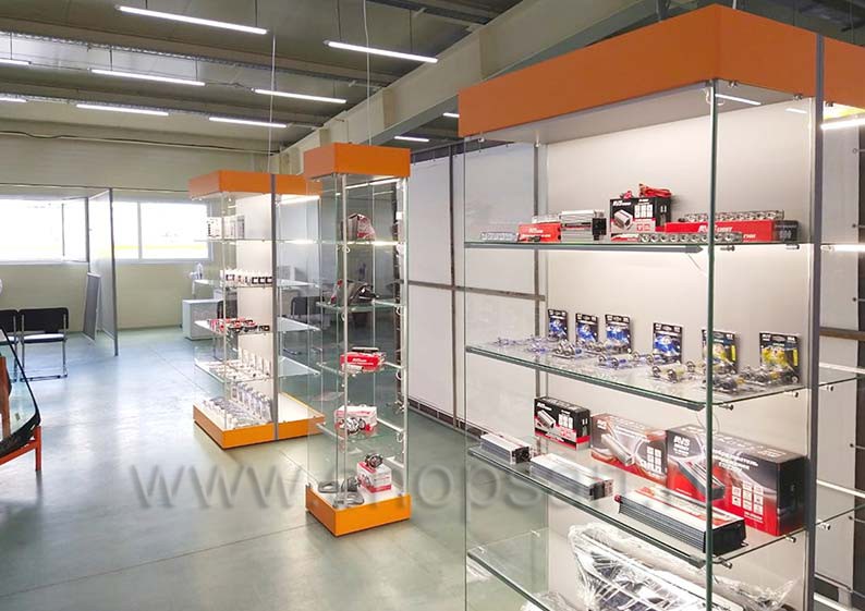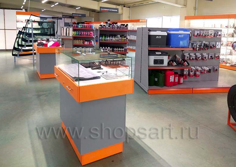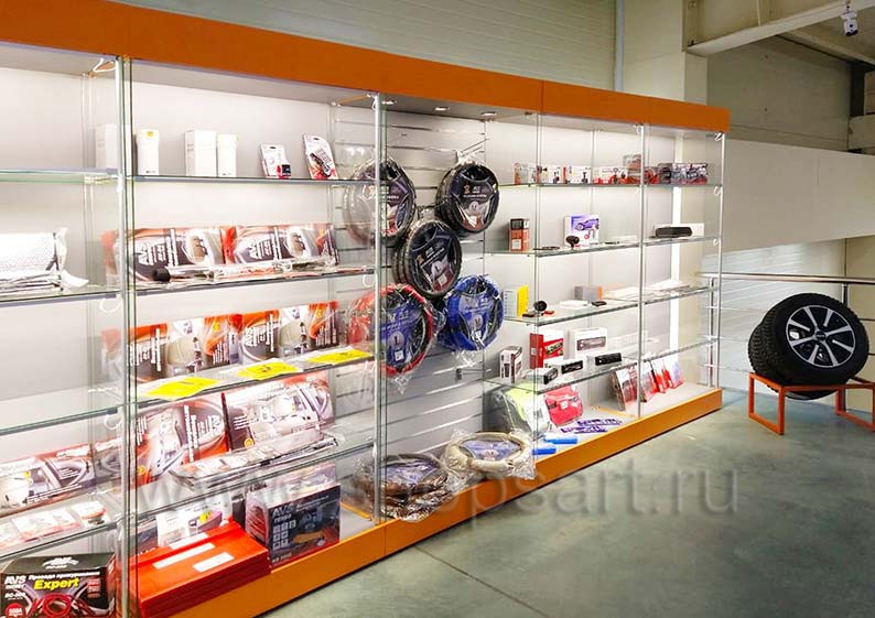 Для размещения запчастей маленьких размеров удобно использовать витрины. Конструкции данного типа акцентируют внимание посетителей к мелким автотоварам и обеспечивают оптимальный обзор такой продукции благодаря своей прозрачности. Витрина в автосалон является отличным решением и с точки зрения безопасности. Дело в том, что использование такой конструкции позволяет обеспечить сохранность продукции. Размещенный на таком оборудовании товар затруднительно украсть. Часто в стеклянных витринах размещают дорогие запчасти.