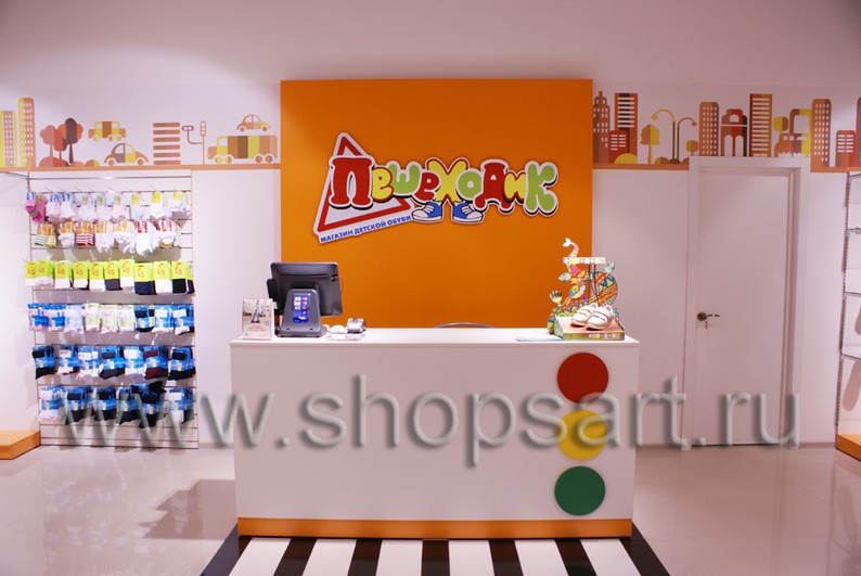 Дизайн-проект магазина детской обуви “Пешеходик” в ТЦ “Рига Молл” на основе коллекции “КАРАМЕЛЬ”