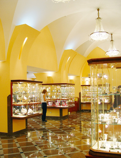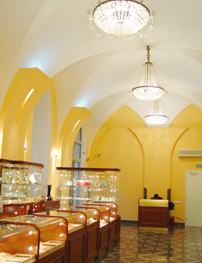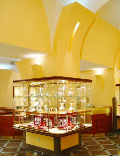 Дизайн интерьера ювелирного магазина “Октябрь”, г. Москва, Фрунзенская набережная, на основе коллекции торгового оборудования «КОРИЧНЕВАЯ КЛАССИКА»