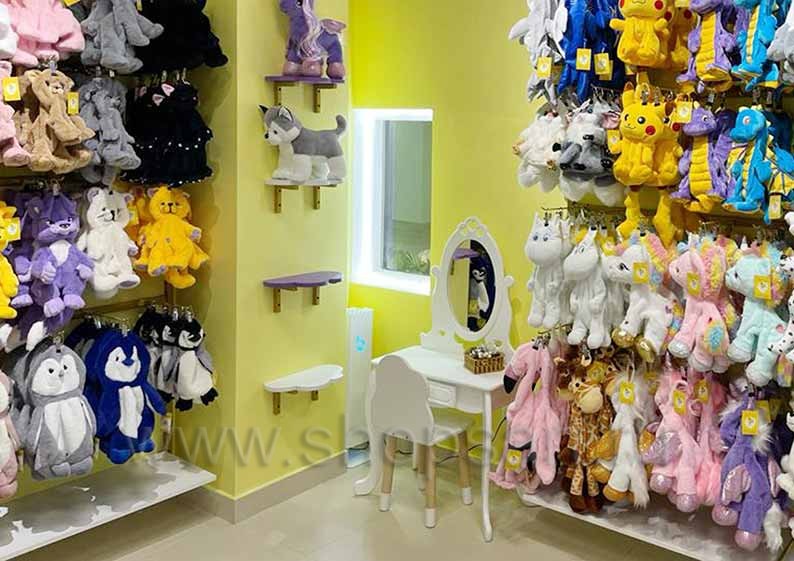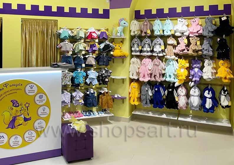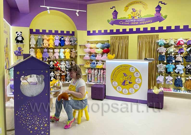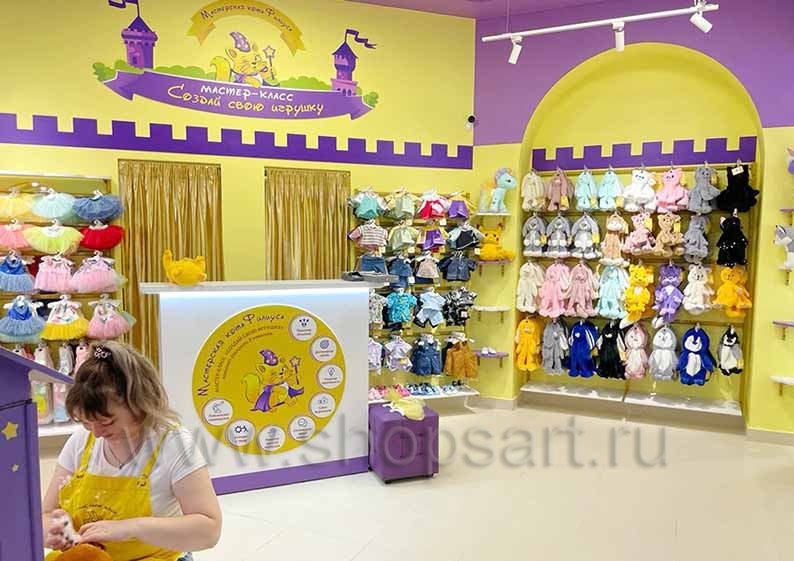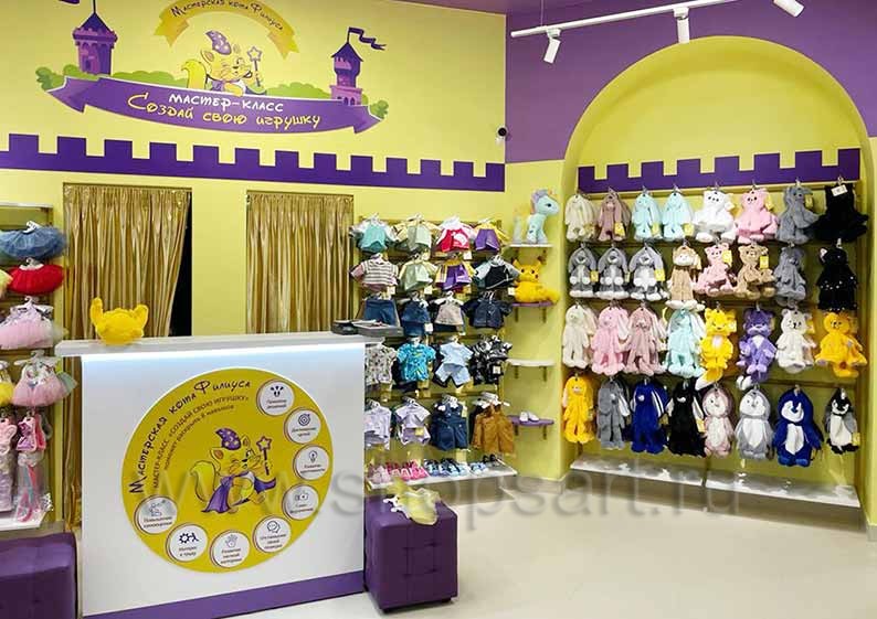 Дизайн интерьера “Мастерская мягких игрушек кота Филиуса”, ТРК “Гранд Каньон”, г. Санкт-Петербург, на основе коллекции торгового оборудования «МАМИН ДОМ»