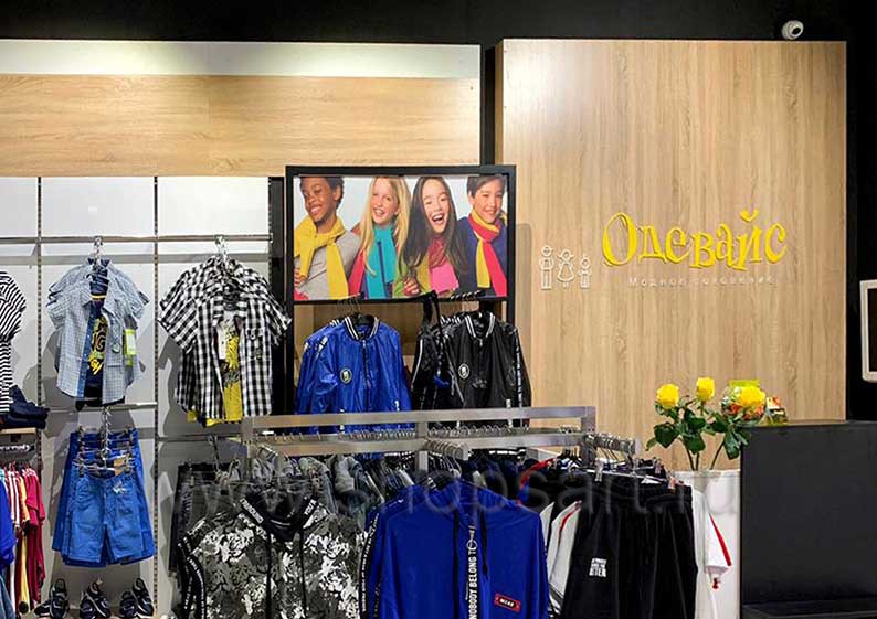 На данной странице представлены фотографии торгового оборудования детского магазина одежды ОДЕВАЙС, коллекция Радуга.