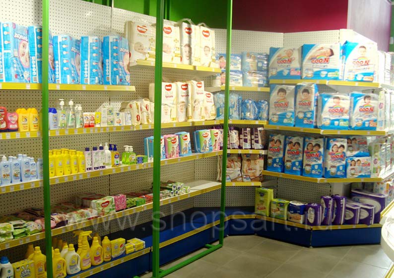Такое оборудование очень удобно для размещения и презентации игрушек, различных аксессуаров для детей и продукцию для новорожденных. Товары для младенцев желательно размещать на средней высоте (примерно на расстоянии 120 см от пола). Так вы обеспечите комфортное совершение покупок беременным или только недавно родившим женщинам, ведь им не придется наклоняться за необходимыми их малышам изделиями. Если вы хотите увидеть, как выглядит образцово оформленное коммерческое помещение, посмотрите на фотографии торгового оборудования детского магазина в Green Park, коллекция Цветные металлические стеллажи. Такое функциональное и стильное оснащение обязательно привлечет покупателей.