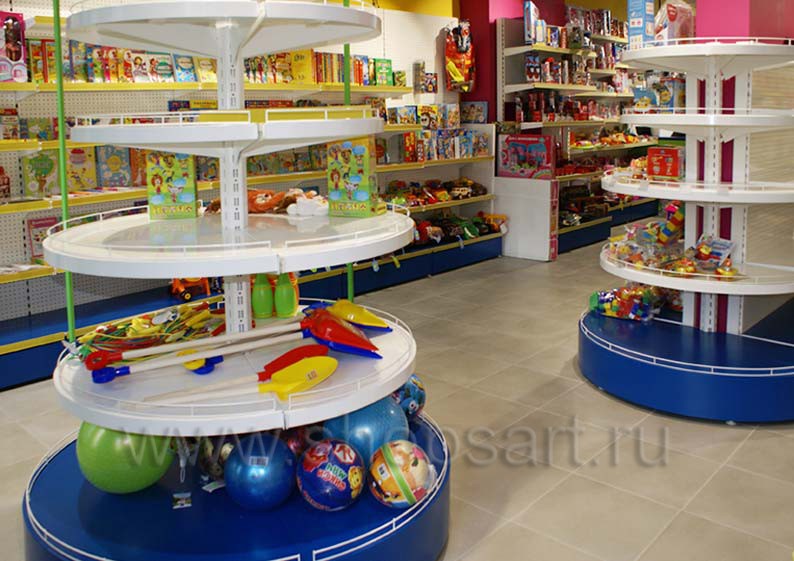Интересным вариантом оснащения детского магазина являются овальные стеллажи. Также удобны в использовании и вместительны стеллажи, оснащенные сетчатыми корзинами, и конструкцией с перфорацией. Однако установку последних двух видов оборудования необходимо выполнять на достаточно высоте. Этого требуют правила безопасности при оснащении детского магазина.
