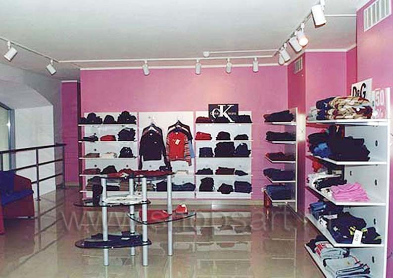 - Стеллажи. Это универсальное торговое оборудование, пригодное для презентации самых разных товарных позиций (например, детского белья и трикотажных изделий).