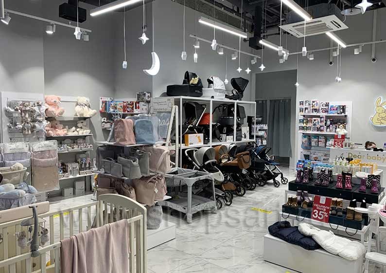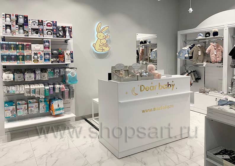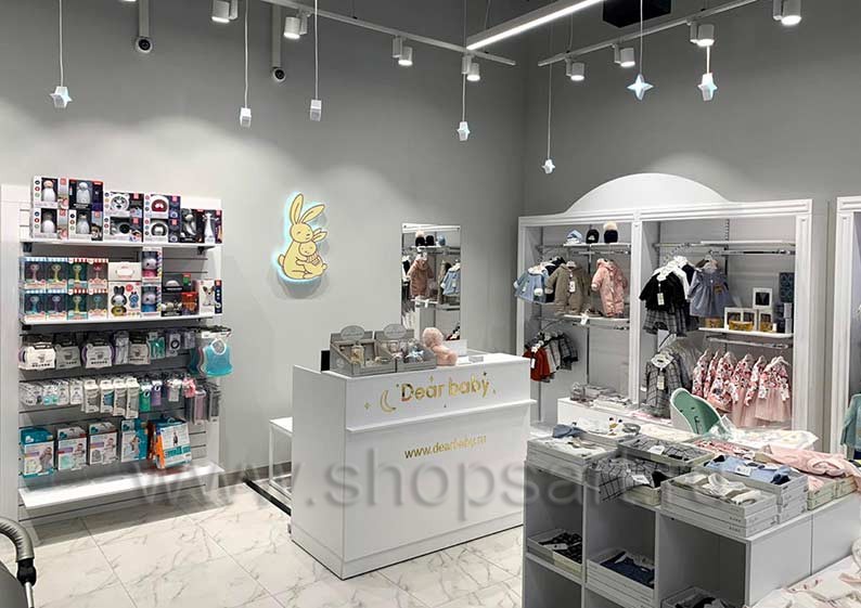 На этой странице Вы можете ознакомиться с фотографиями торгового оборудования в открытом магазине детской одежды «Dear Baby», находящемся в ТРЦ “Ривьера”, Автозаводская улица, 18, город Москва, на основе коллекции торговой мебели «БЕЛАЯ КЛАССИКА».