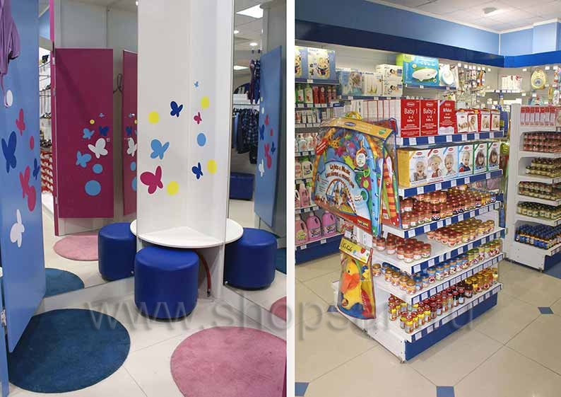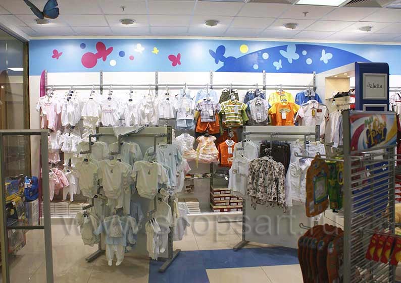 Если в магазине наряду с одеждой представлена детская обувь, то понадобятся островные конструкции, полки и демонстрационные столы. Размещать вещи для малышей (платья, юбки, брюки и т.д.) рекомендуется на окрашенных металлических пристенных стойках и гондолах.