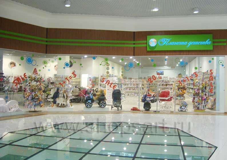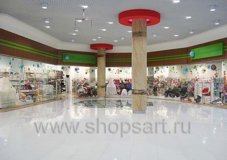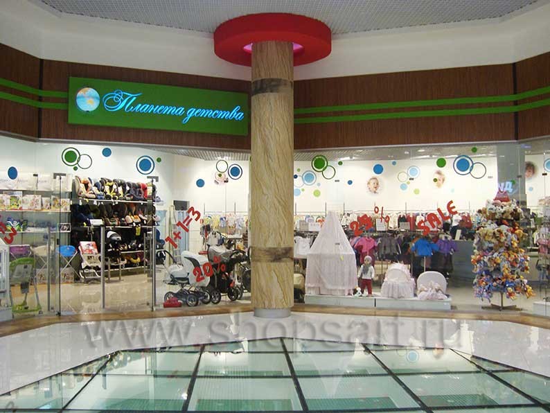 Дизайн интерьера магазина детской одежды “Планета детства”, ТРЦ «Азовский» г. Москва, на основе коллекции торгового оборудования «ГОЛУБАЯ ЛАГУНА»