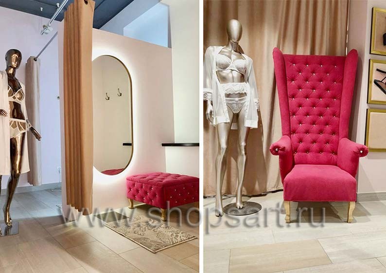 В силу специфики таких товаров, как нижнее белье и парфюмерия торговая мебель должна подбираться изящная (не такая, как оборудование для салонов мужской одежды). Желательно применение конструкций в нежных цветовых оттенках. В магазине нижнего белья и парфюмерии будет уместна мебель в светлых или теплых тонах. Рекомендуется использование оборудования для торговли оснащенное яркой подсветкой.