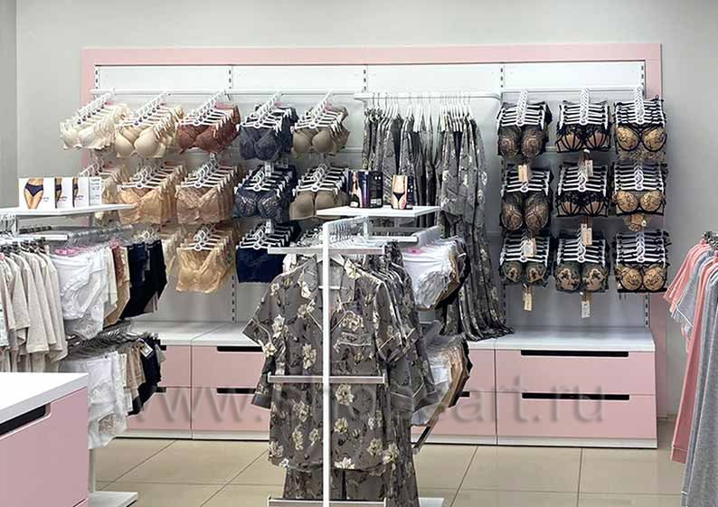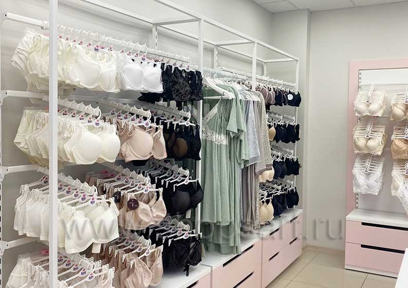 Презентацию бельевых комплектов удобно выполнить, используя вешалки. Их размещают на стеллажах, оснащенных перекладинами из металла либо кронштейнами. Нередко в магазинах белья продаются сопутствующие товары (например, колготки, чулки, домашняя одежда). Их можно разместить на стеллажах, оснащенных полками. Очень удобны в применении торговые конструкции, укомплектованные накопителями для хранения товаров.